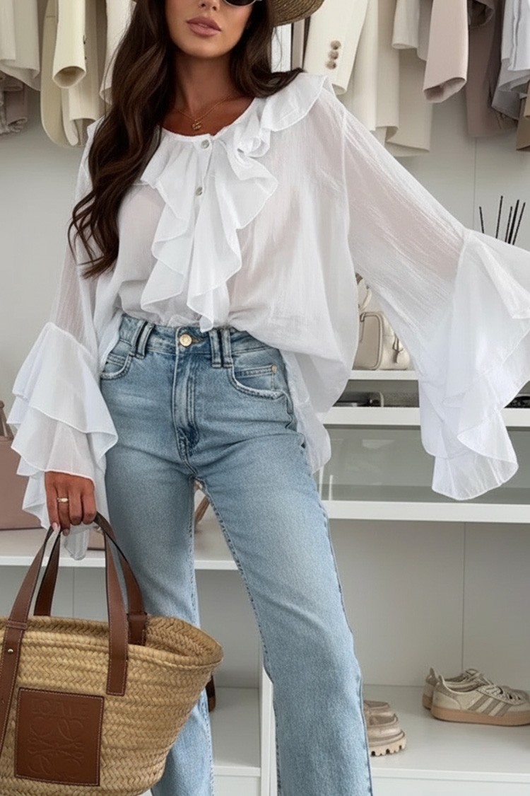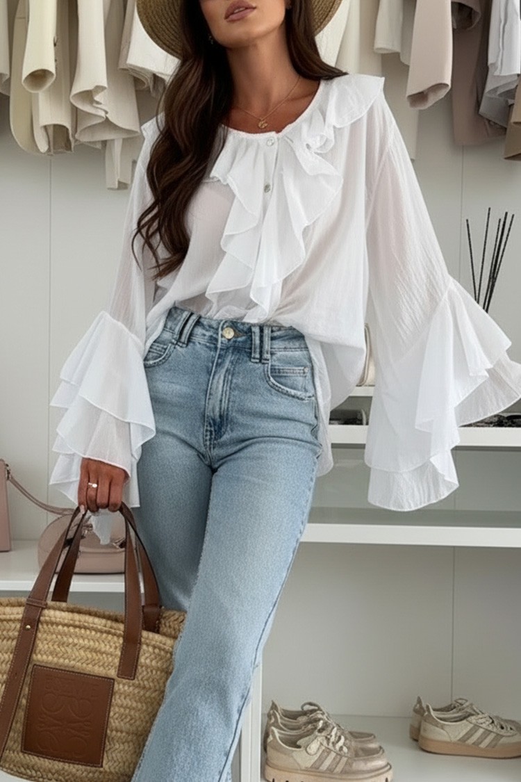 - Model ma luźny krój, guziki, atrakcyjny krój i falbanki na całej długości.