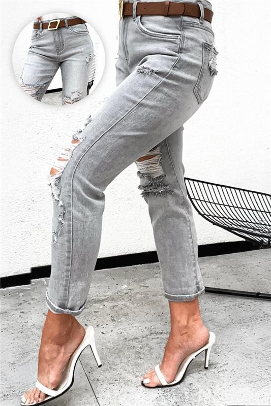 - Model ma wysoki stan, jasnoszary wzór i nowoczesny efekt przetarć z przodu i z tyłu.