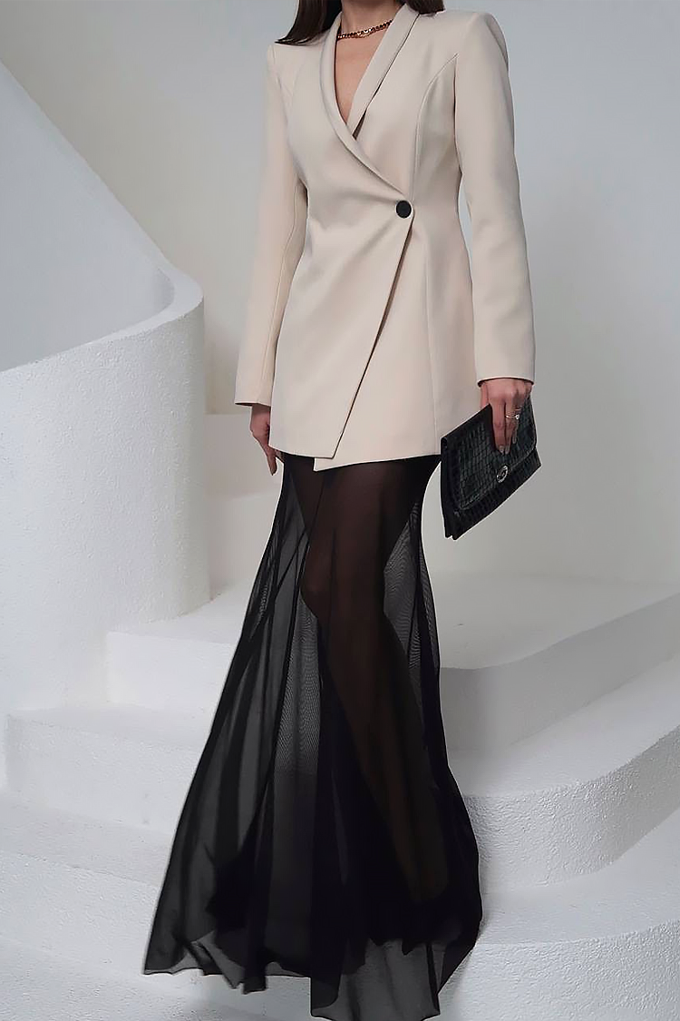 - Spódnica charakteryzuje się klasycznym stanem, długą długością i transparentnym materiałem.