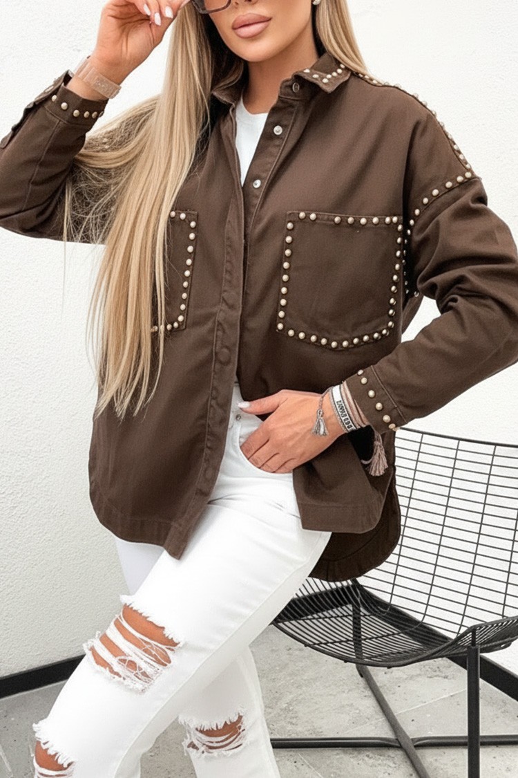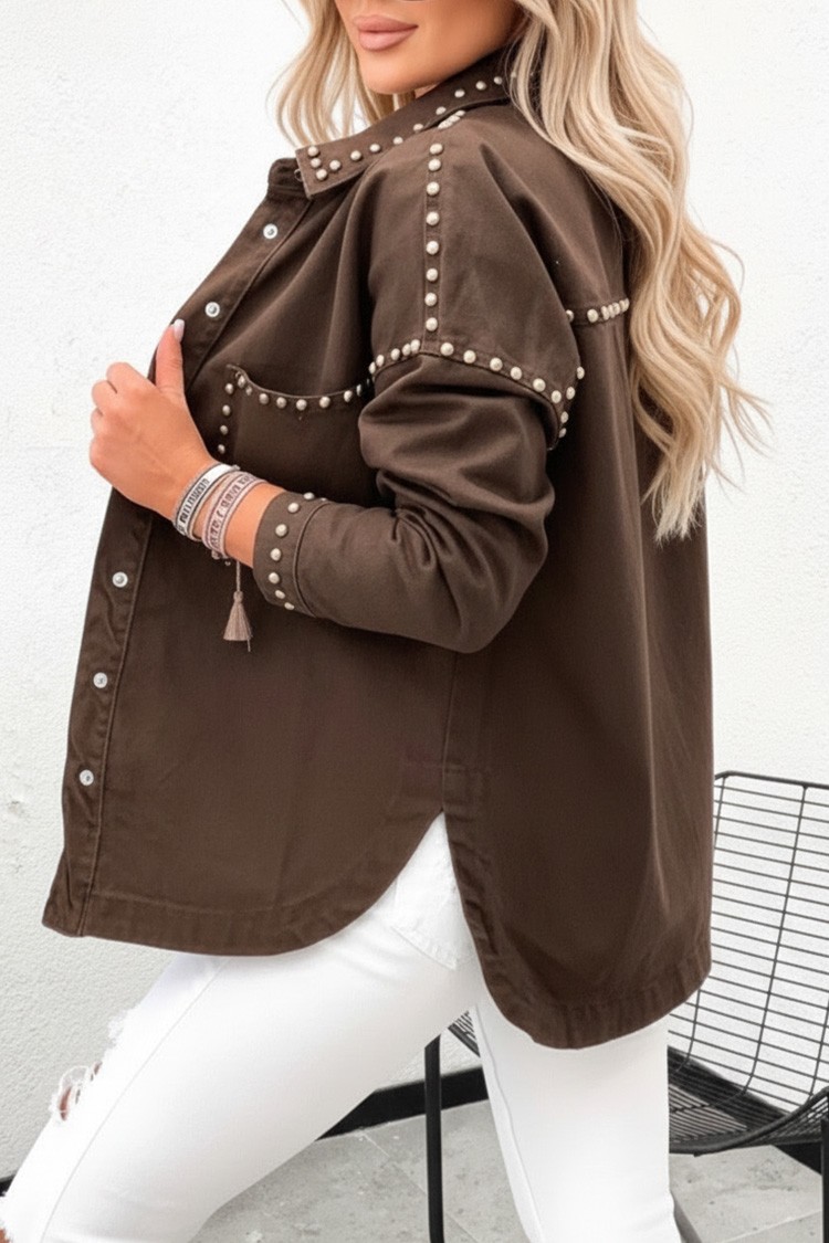 - Model ma wygodny, oversize'owy krój, brązowy kolor, zapięcie na guziki na całej długości i oczka.