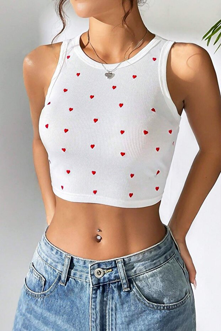 - Model ma dopasowany krój, wzór w serca, długość crop i jest w kolorze białym.