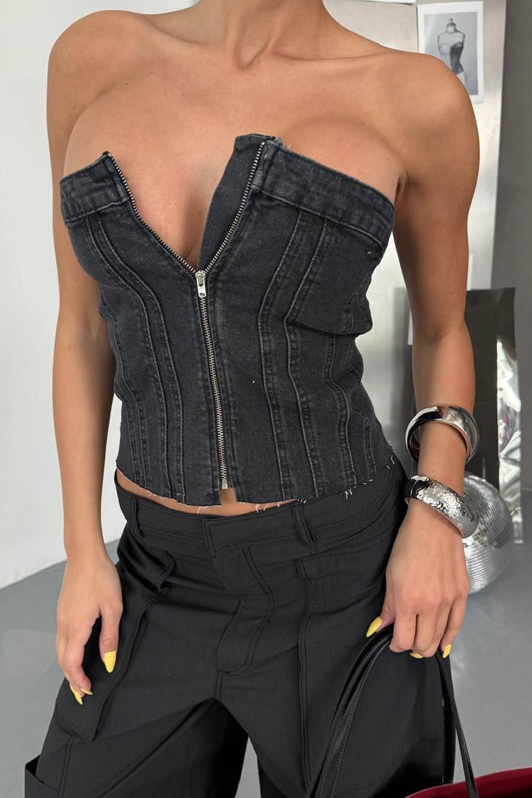 - Dopełnij swój atrakcyjny look o jeansowy gorset, odpowiedni na co dzień i do modnych stylizacji.
