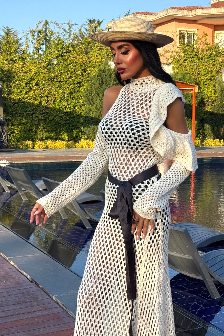 - Model ma długie rękawy, odkryte ramiona, seksowny krój i czarny pasek w talii