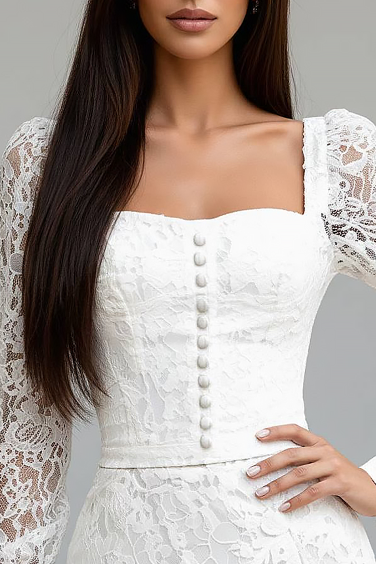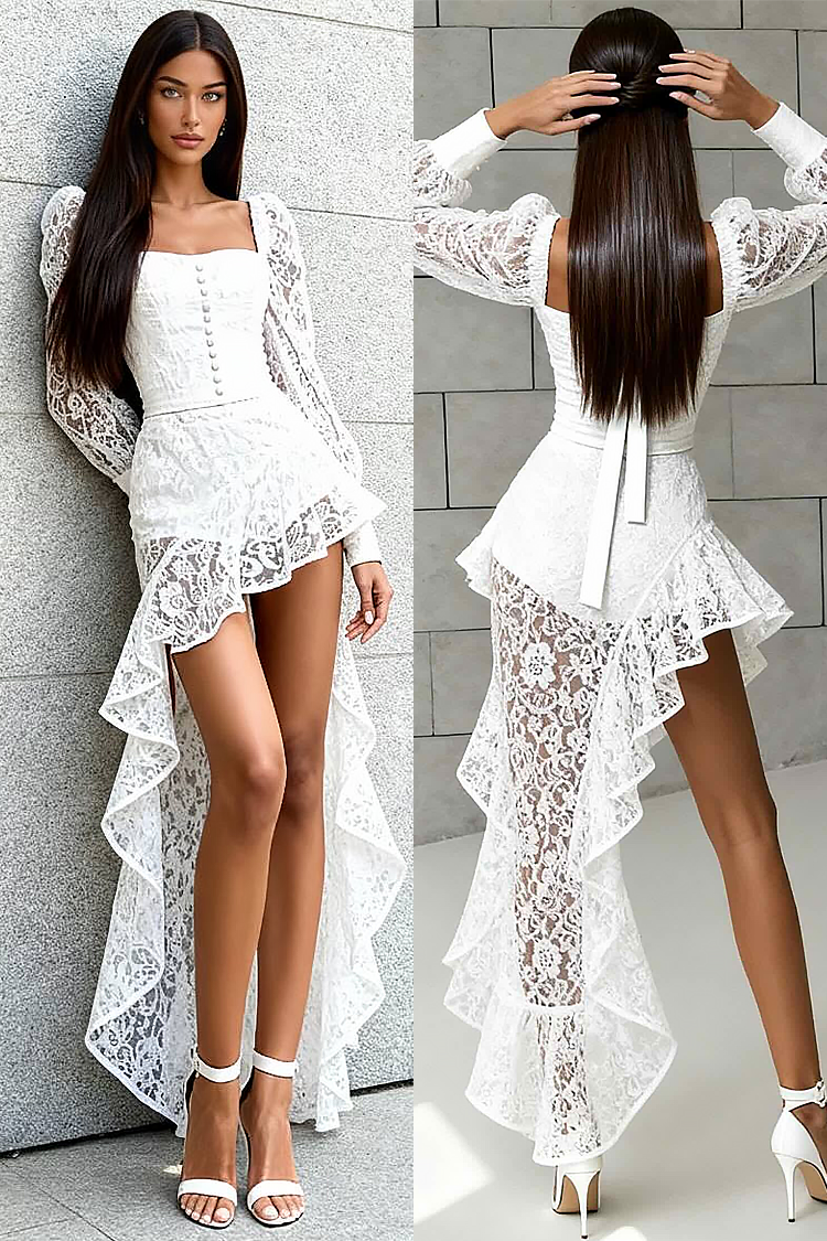 - Model ma dopasowany krój, asymetryczny krój, seksowną koronkę, długie rękawy i guziki.