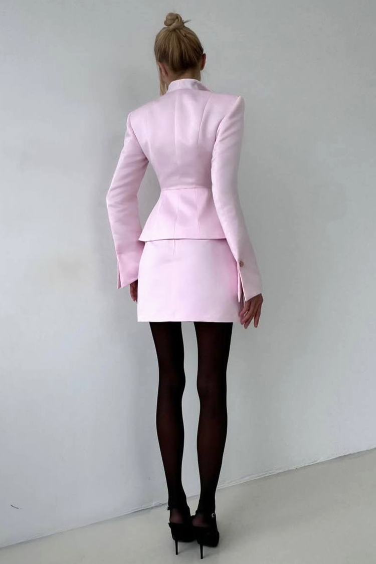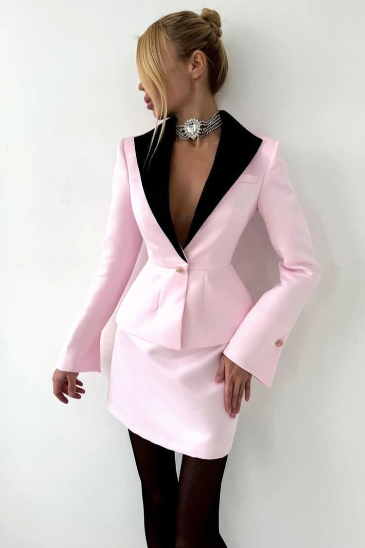 - Marynarka ma elegancki krój i efektowny, czarny kołnierz, a spódnica jest krótka.