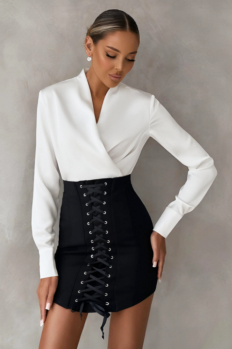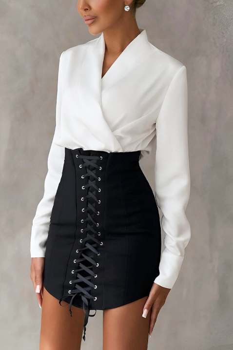 - Spódnica ma dopasowany krój, krótką długość, czarny kolor i efektowne wiązania.