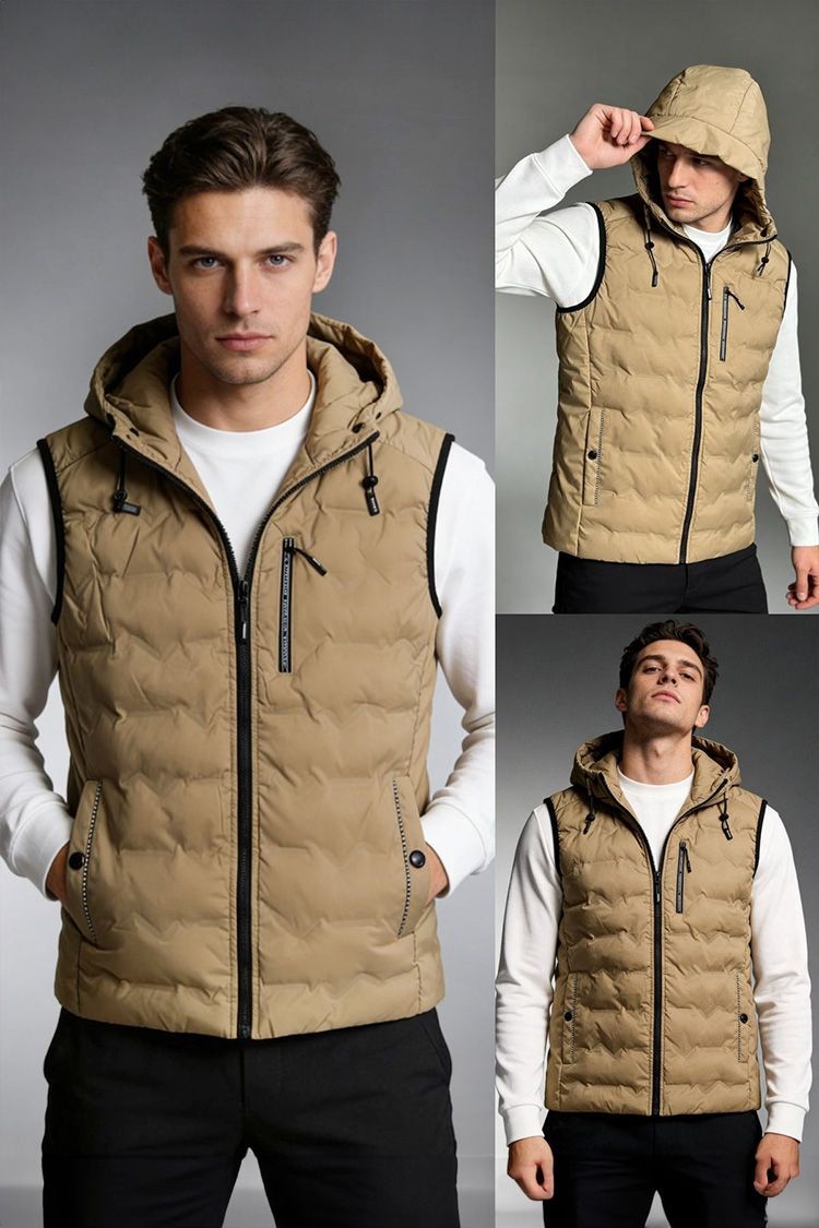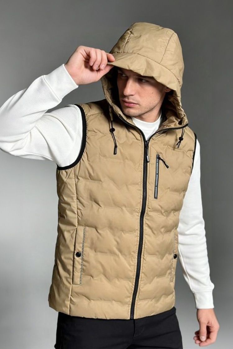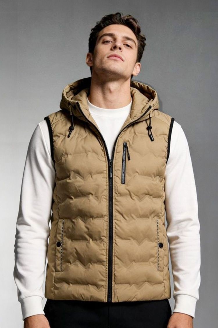 - Sportowa męska kamizelka w kolorze beżowym z kapturem na stałe, wiązanym paskiem, idealna do noszenia na co dzień.