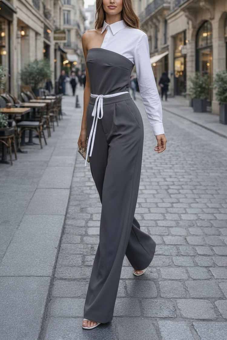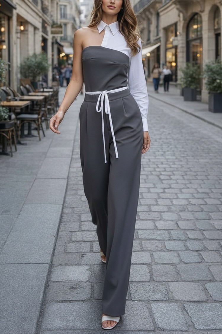 - Górna część to seksowny top o asymetrycznym kroju, z kołnierzykiem i łączonym materiałem.