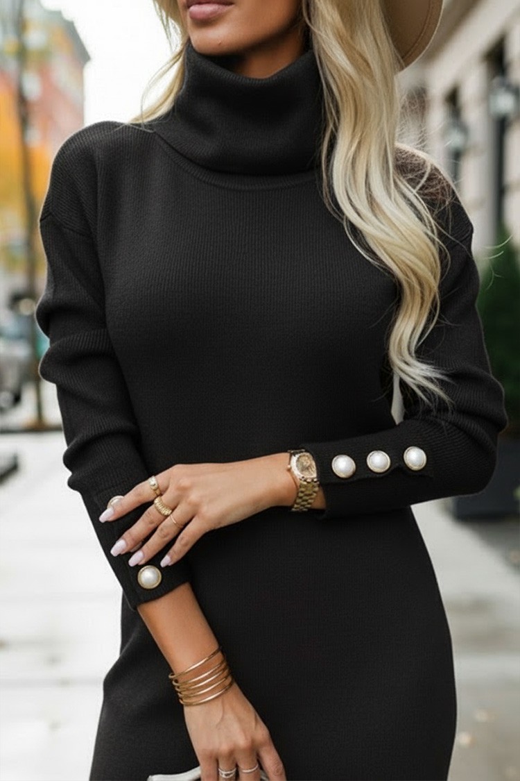 - Model ma efektowny, dopasowany krój, nowoczesne guziki, długie rękawy i efektowny kołnierz.