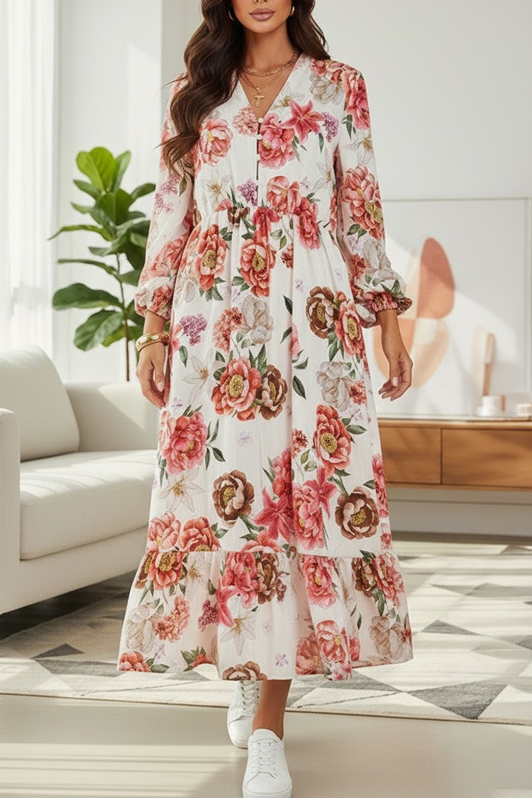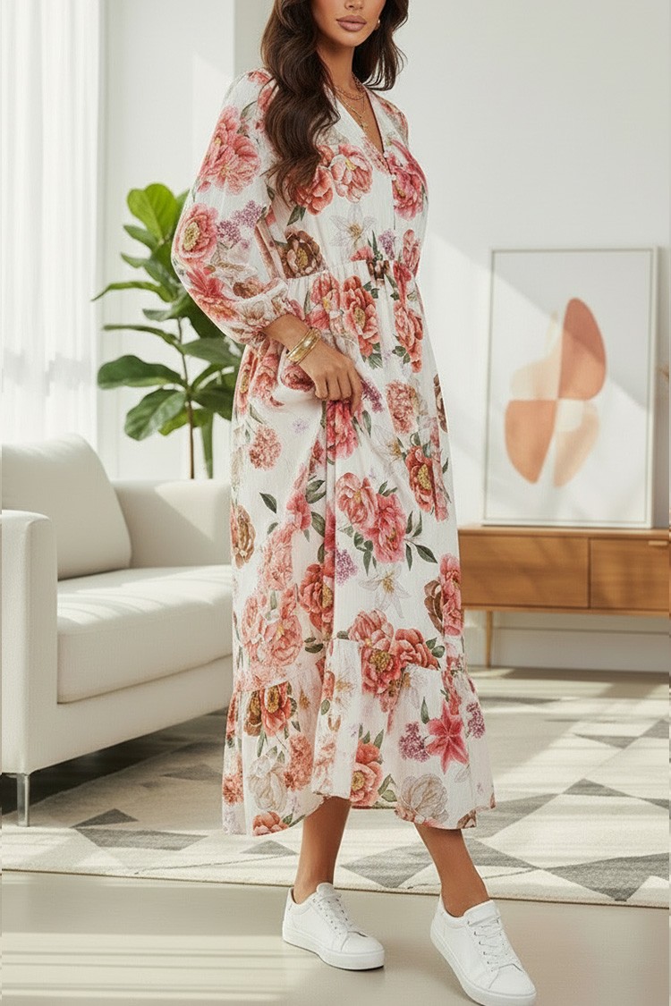 - Model ma luźny krój, długie rękawy i kwiatowy wzór.