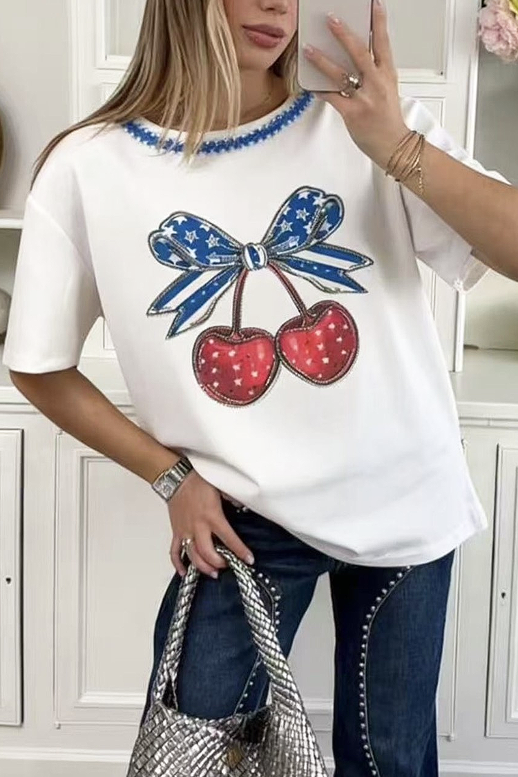 - Model ma krótkie rękawy, okrągły dekolt, klasyczny krój i efektowny nadruk w wiśnie.