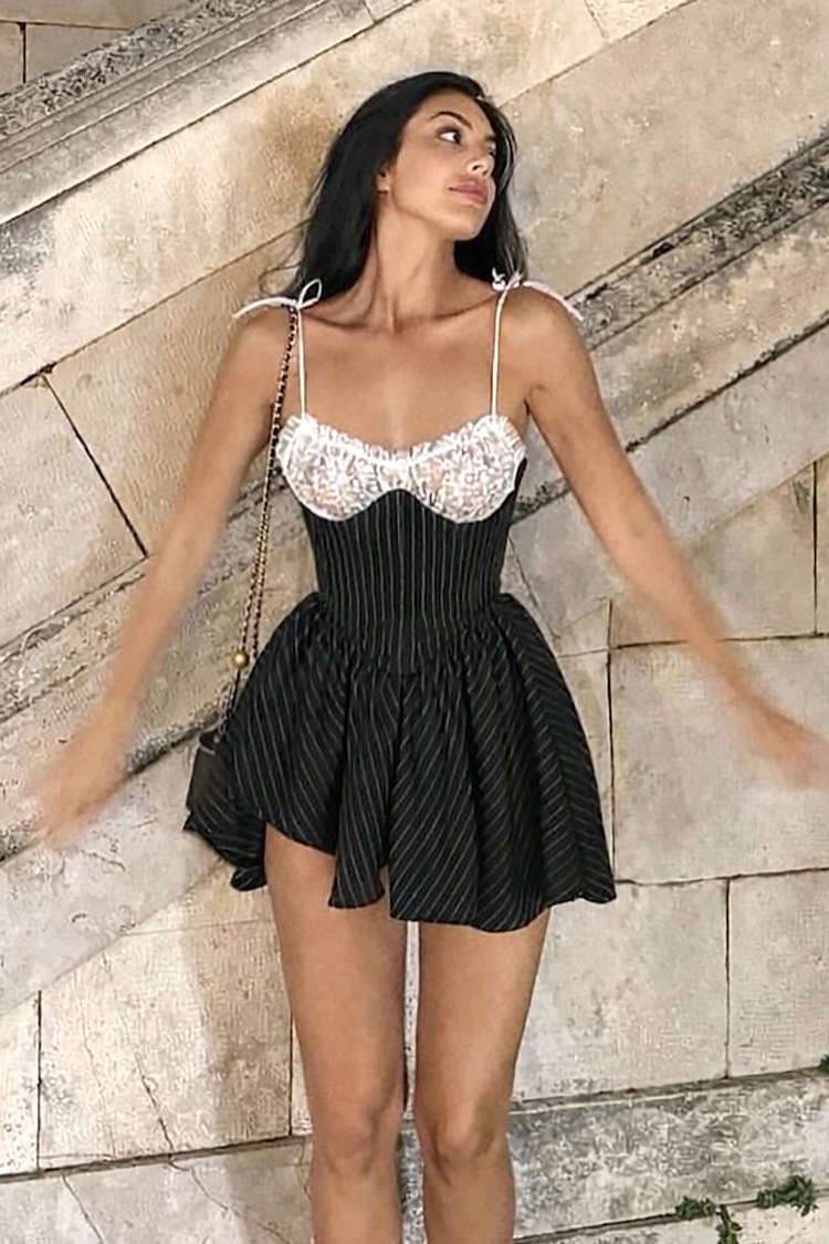 - Model ma atrakcyjny dekolt z białą koronką, wzór w paski i seksowny wzór.