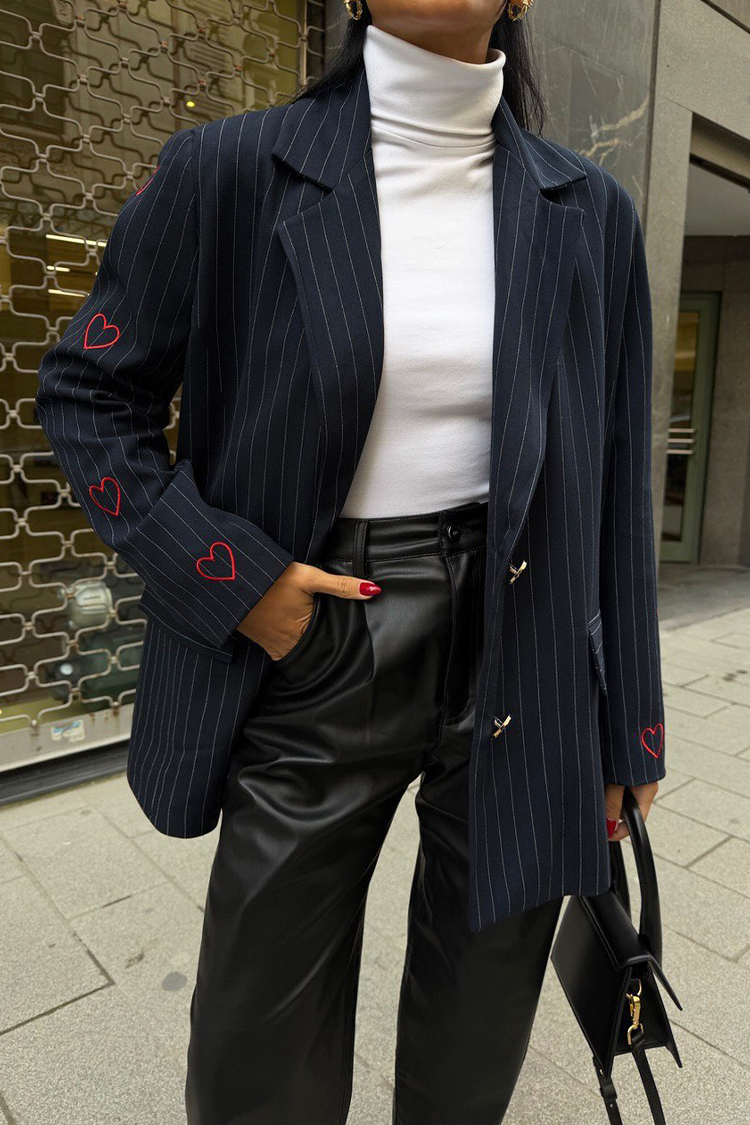 - Połącz styl z wygodą! Model ma oversize'owy krój, kołnierz, kieszenie oraz wzór w paski i serca.