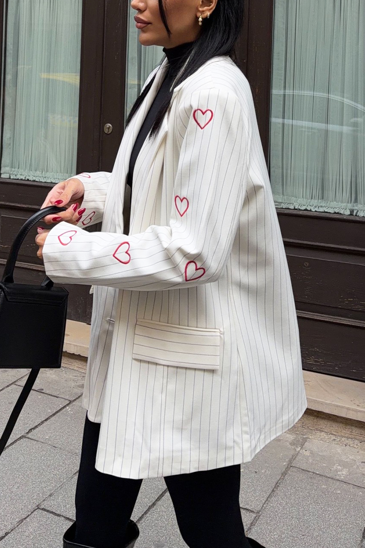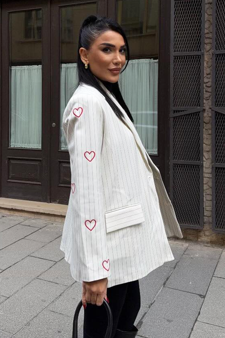 - Połącz styl z wygodą! Model ma oversize'owy krój, kołnierz, kieszenie oraz wzór w paski i serca.