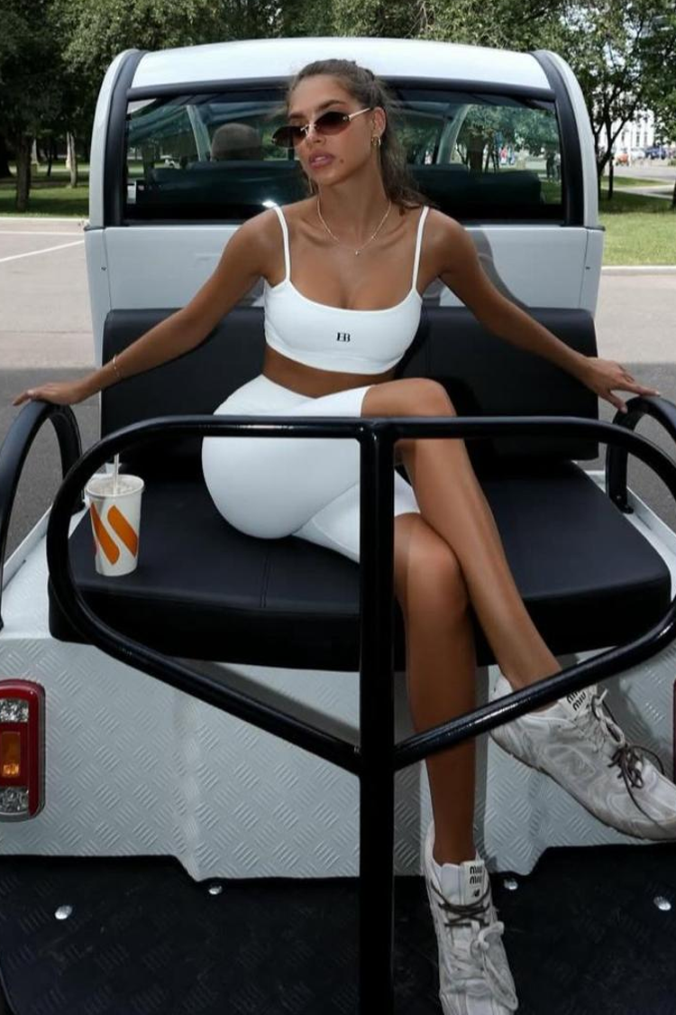 - Góra ma dopasowany krój i skróconą długość, a legginsy podkreślają kobiece kształty.