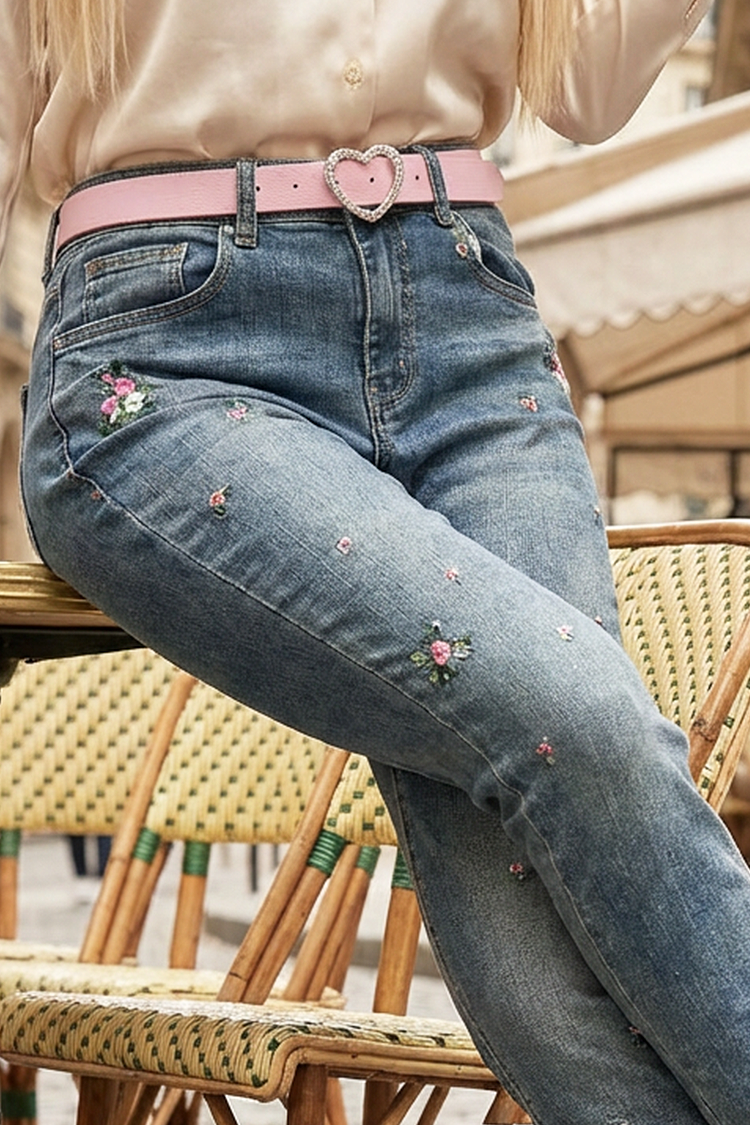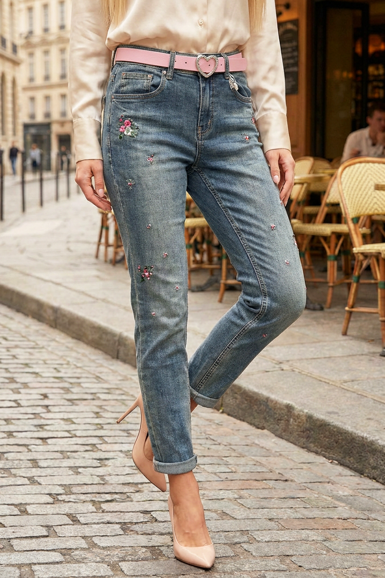 - Model ma wysoki stan, dopasowany krój, różowy pasek i kwiatowy haft.