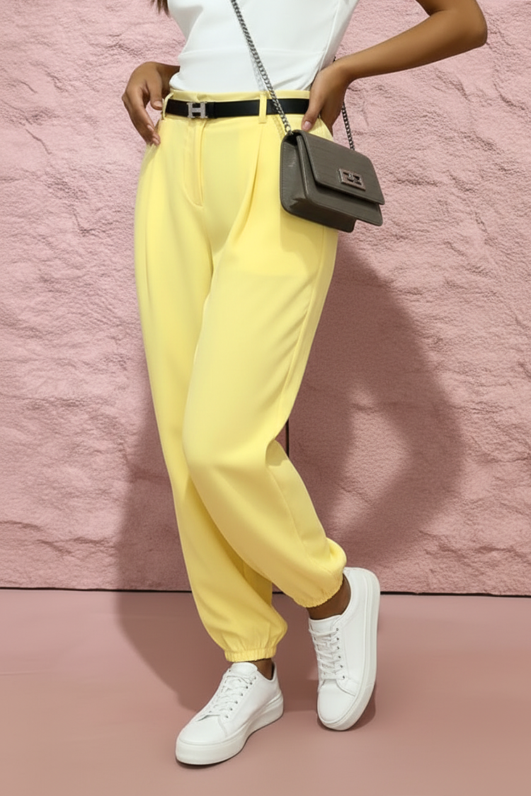 - Aby uzyskać idealny wygląd, wybierz te nowoczesne spodnie w modnym kolorze.