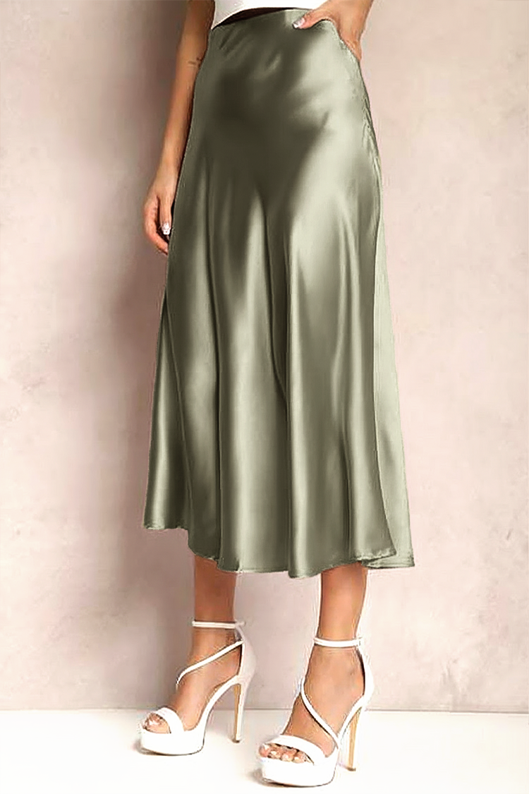 - Model ma wysoki stan, rozkloszowany krój i satynową tkaninę.
