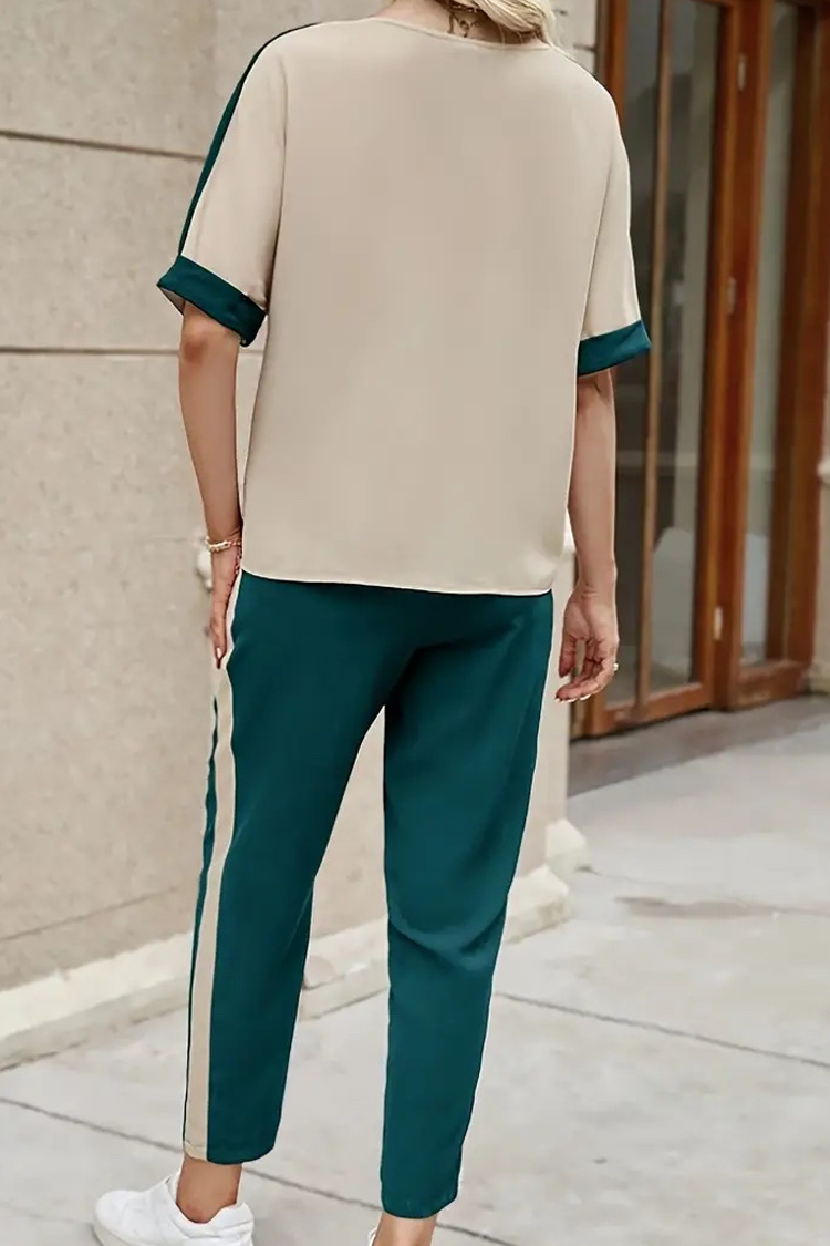 - Bluzka ma krótkie rękawy i wygodny krój, pasujący do każdej sylwetki. Spodnie mają wysoki stan i długie nogawki.