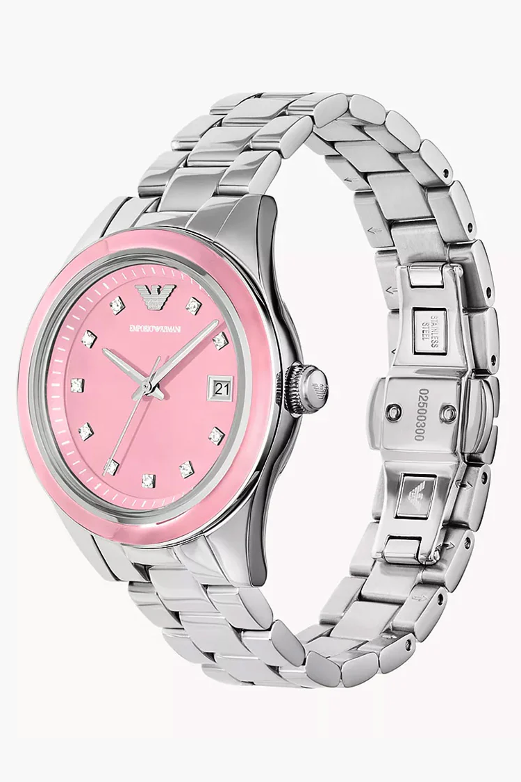 Elegancki model z różową tarczą ozdobioną subtelnymi kryształkami, który łączy kobiecy styl z nowoczesnym designem. Stalowa koperta (36 mm), srebrna bransoleta oraz precyzyjny mechanizm kwarcowy zapewniają trwałość i komfort noszenia. Wodoszczelność 5 ATM sprawia, że zegarek doskonale sprawdzi się na co dzień i przy wyjątkowych okazjach.