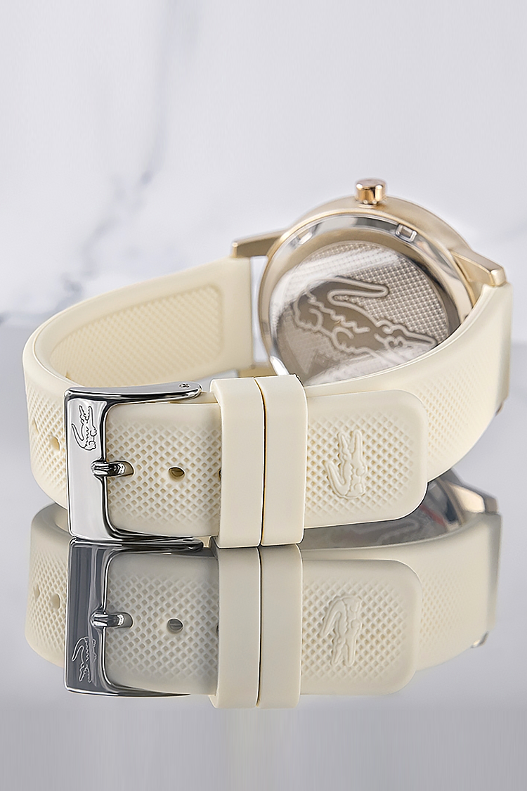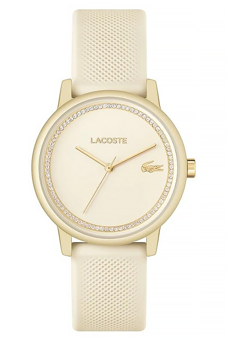 Zegarek damski Lacoste 12.12 Go 2001288. Elegancki model z złoconą tarczą otoczoną subtelnymi cyrkoniami, które dodają mu blasku i kobiecego charakteru. Pasek w odcieniu kości słoniowej oraz złote logo krokodyla tworzą stylową, harmonijną całość – idealną zarówno na co dzień, jak i na wyjątkowe okazje.