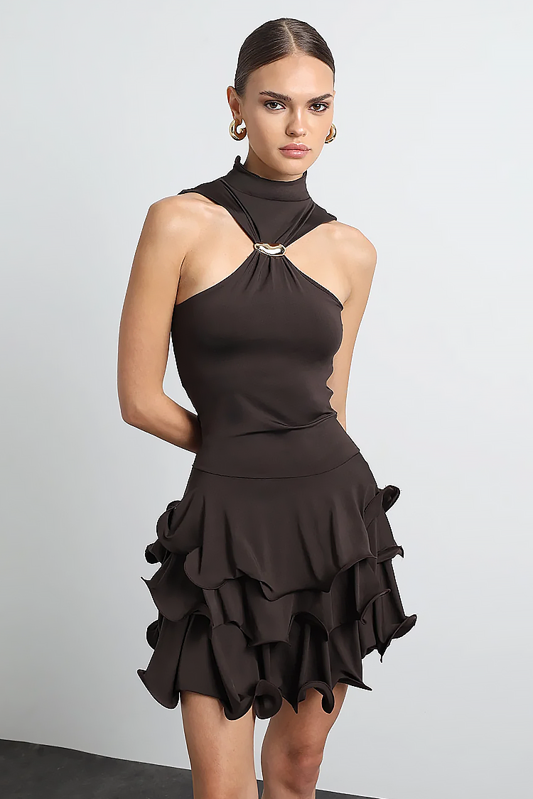 - Model ma krótki krój, seksowny krój, dopasowany krój, brązowy kolor i asymetryczną górę z metalowym detalem.