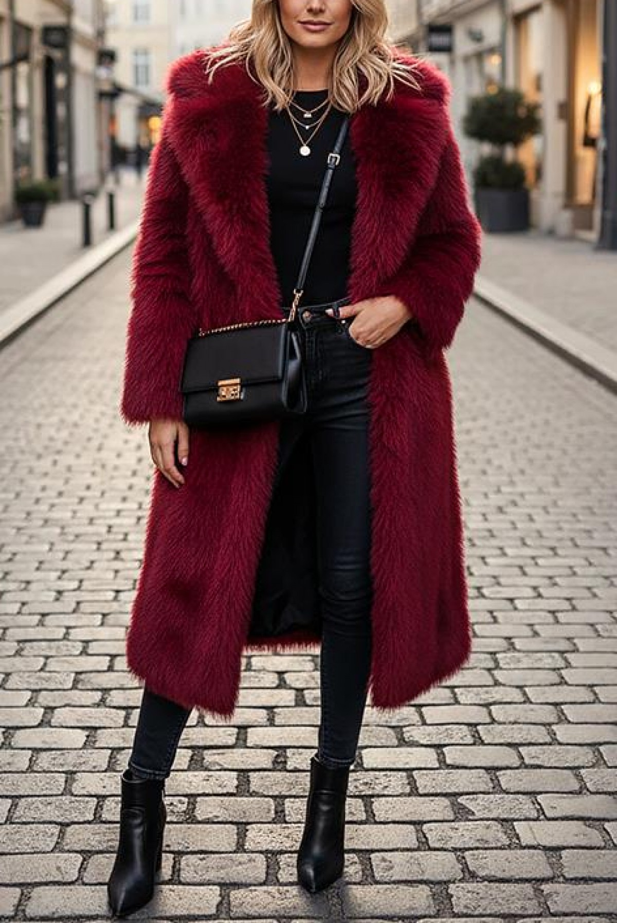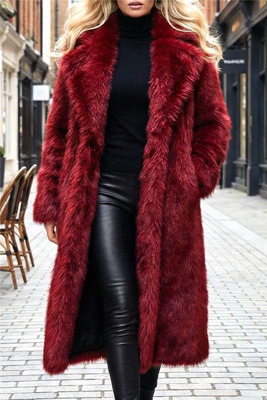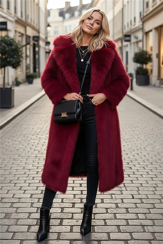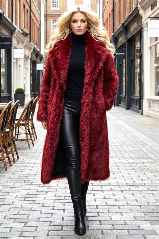 - Model ma klasyczny i elegancki krój, obszerny kołnierz i bordowy kolor.
