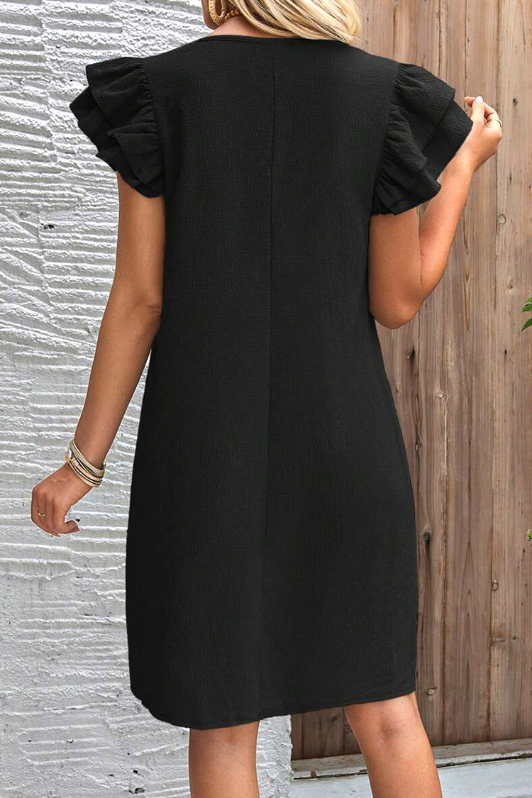 - Krótka sukienka w jednolitym kolorze i prostym fasonie, idealna na co dzień.