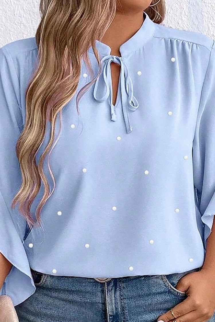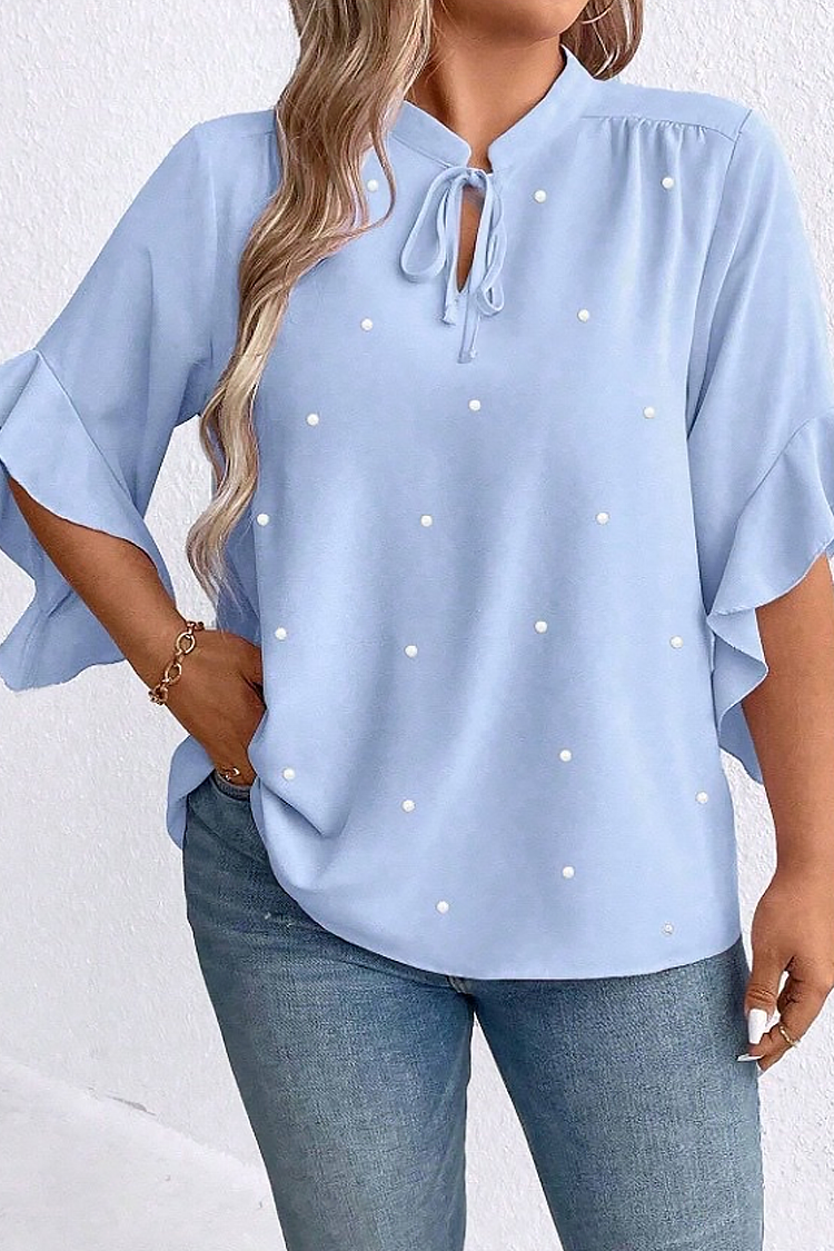 - Model ma wygodny krój, krótkie rękawy, wzór w groszki i wiązanie przy dekolcie.