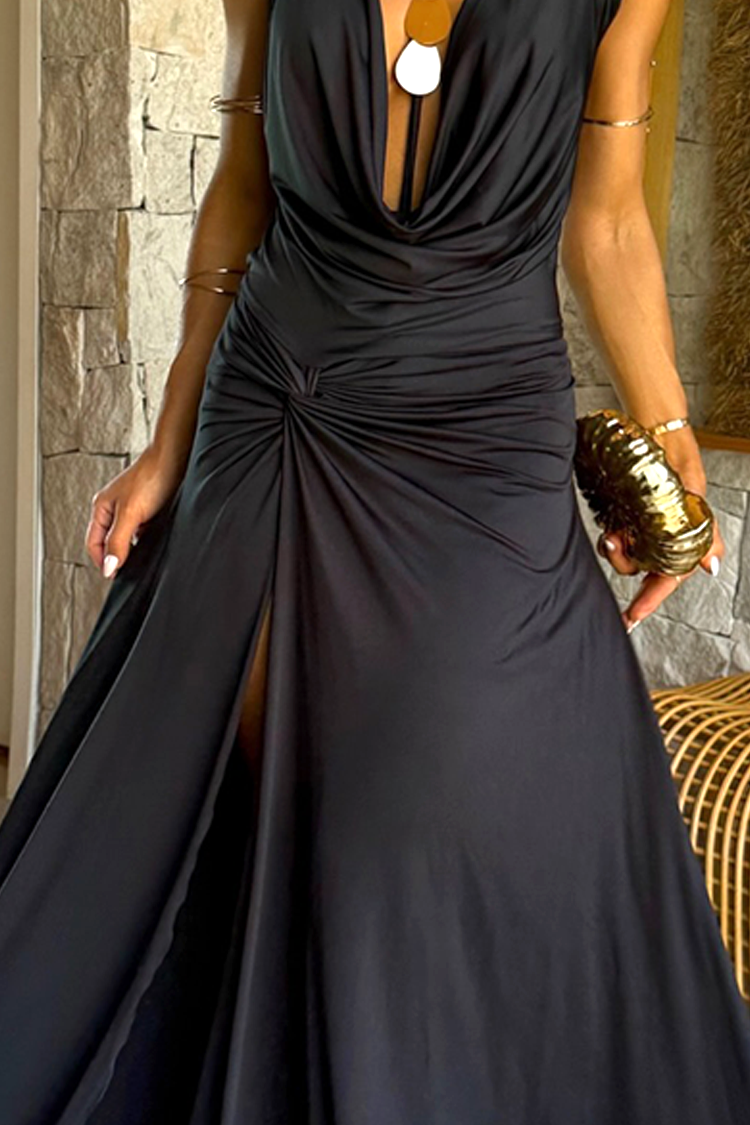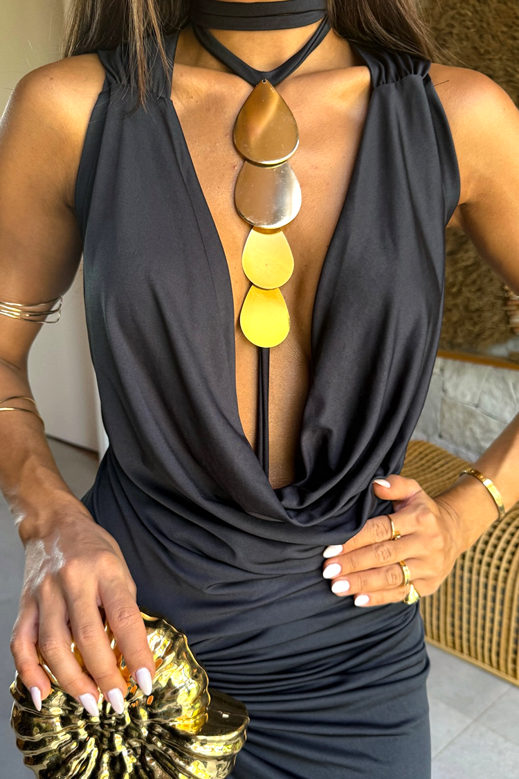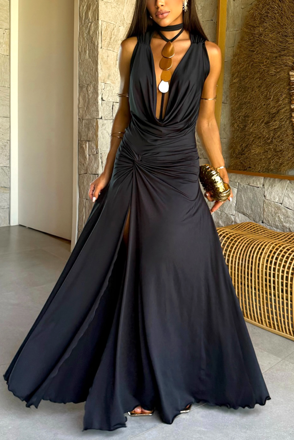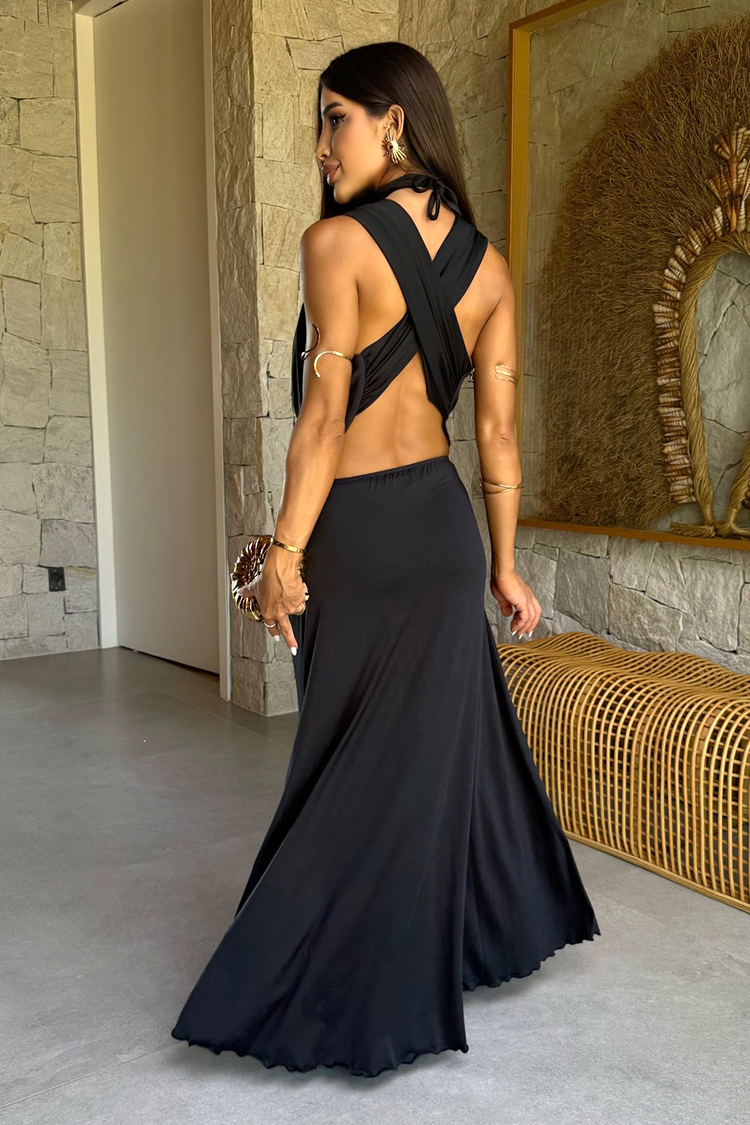 - Aby przyciągnąć wszystkie spojrzenia, wybierz tę długą sukienkę o niesamowitym kroju i klasycznym kolorze.