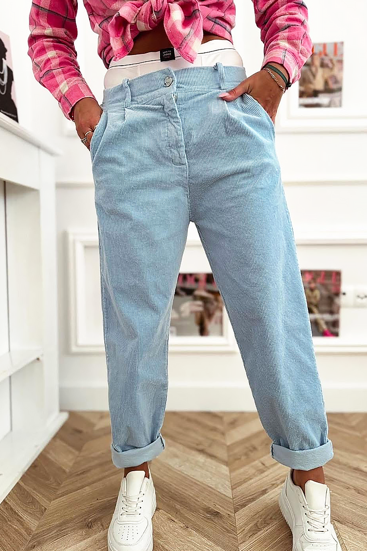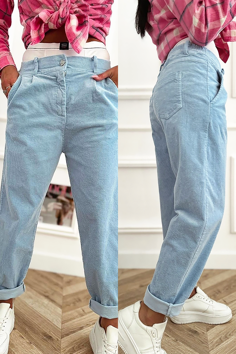 - Model ma wysoki stan, prosty krój i wykończone nogawki z praktycznymi kieszeniami.
