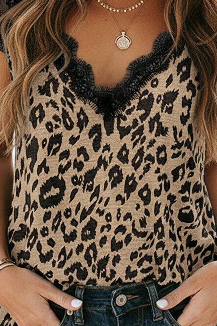 - Model ma luźny krój, nadruk w panterkę i dekolt w serek z koronką.