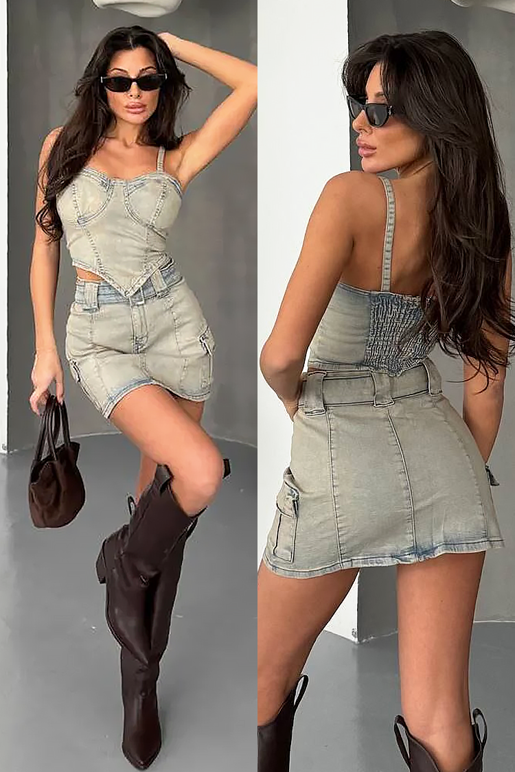 - Dżinsowy komplet: top i krótka spódniczka, idealne do codziennych, modnych stylizacji.