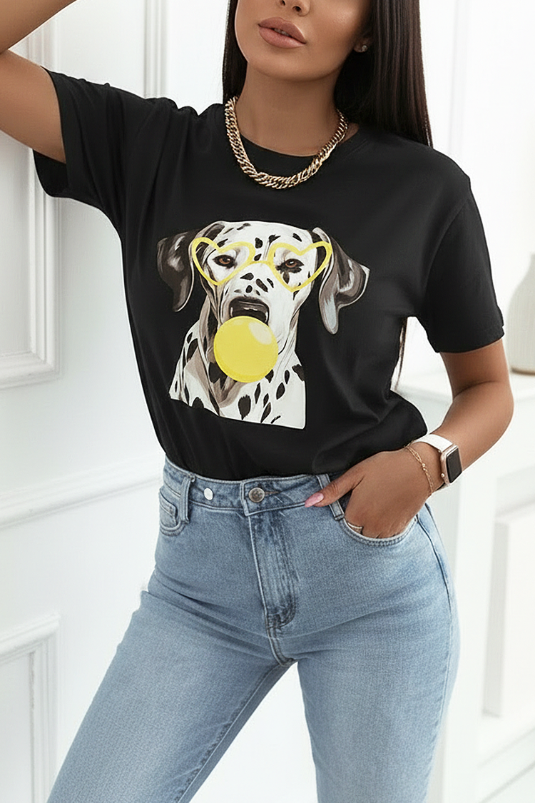 - Model ma krótkie rękawy, okrągły dekolt, klasyczny krój i efektowny nadruk dalmatyńczyka.
