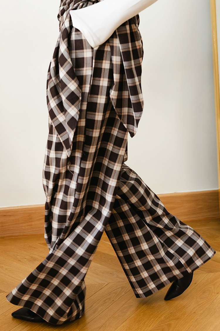- Model ma wysoki stan, luźny krój, kratkę i odpinany pasek.
