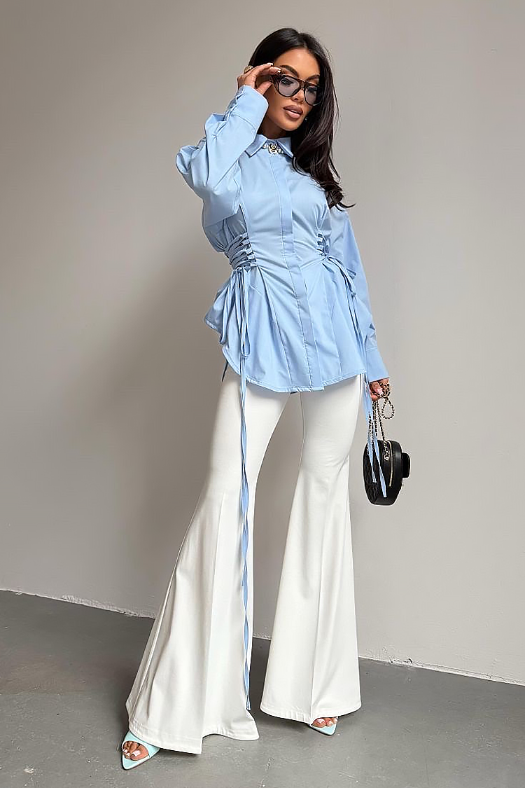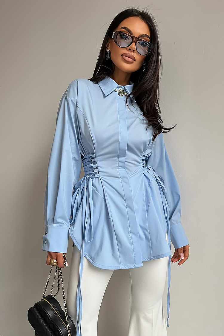 - Model ma elegancki krój, długie rękawy, kołnierzyk, dopasowany krój i wiązanie w talii.