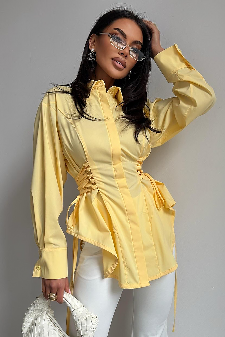 - Model ma elegancki krój, długie rękawy, kołnierzyk, dopasowany krój i wiązanie w talii.
