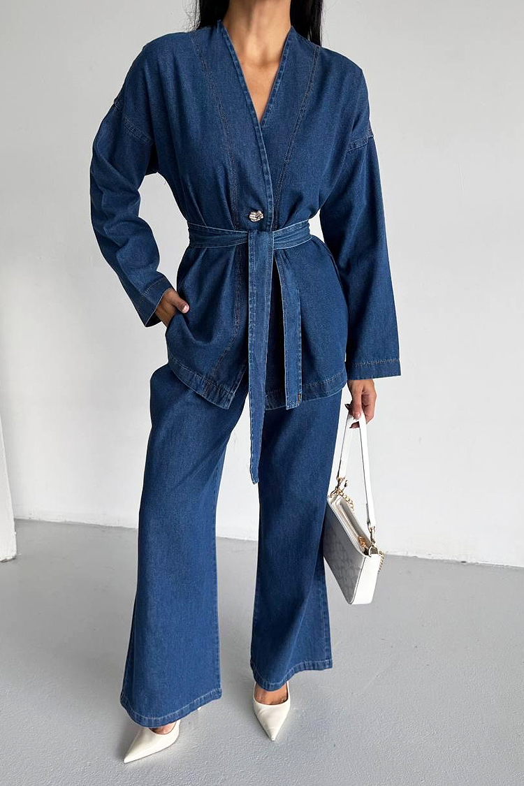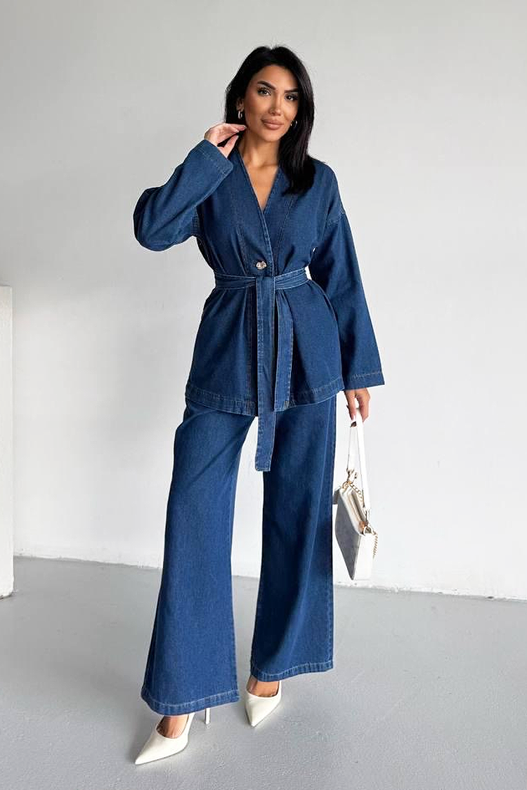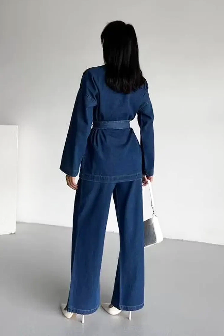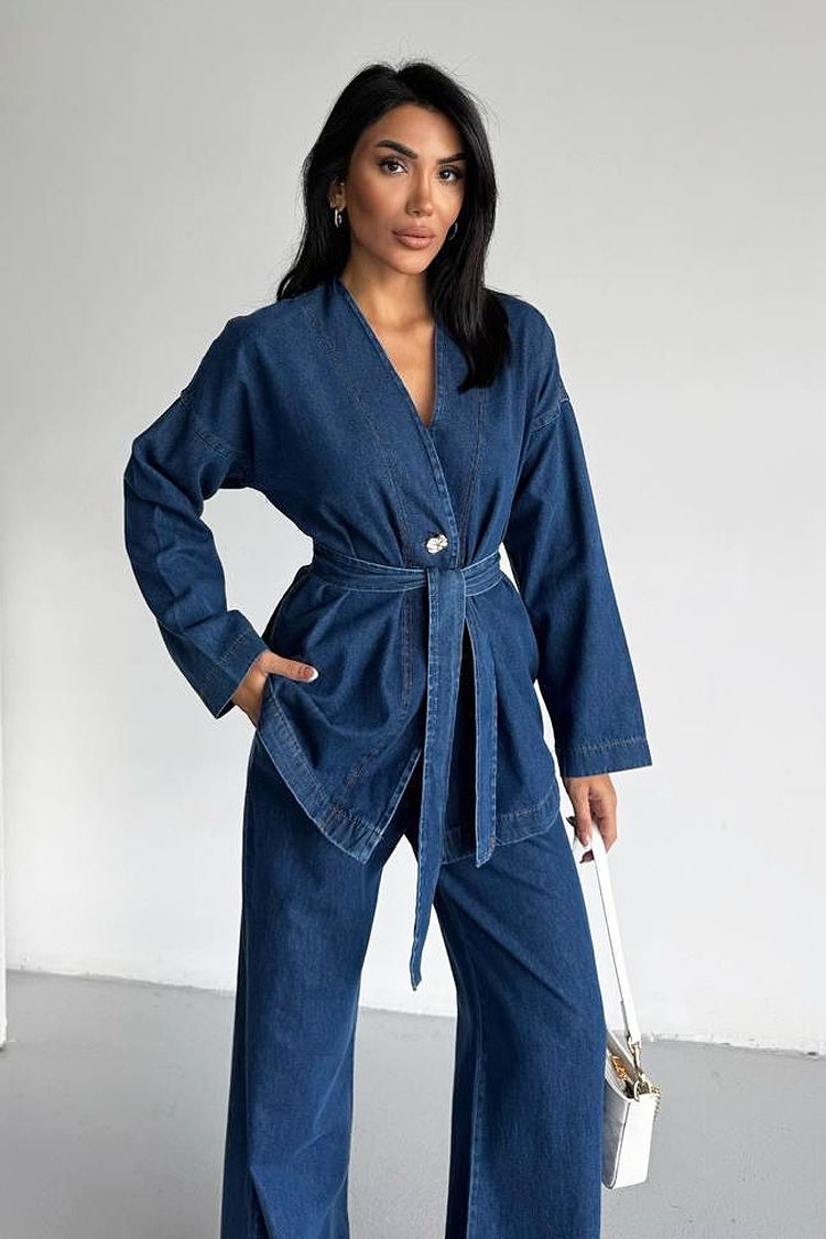 - Góra ma atrakcyjny krój, długie rękawy, guzik i pasek z tego samego materiału.