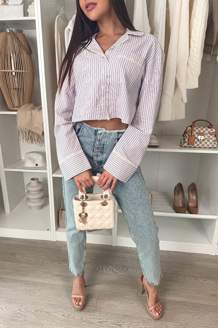 - Model ma długie rękawy, klasyczny kołnierzyk, zalotny krój i krótki krój.