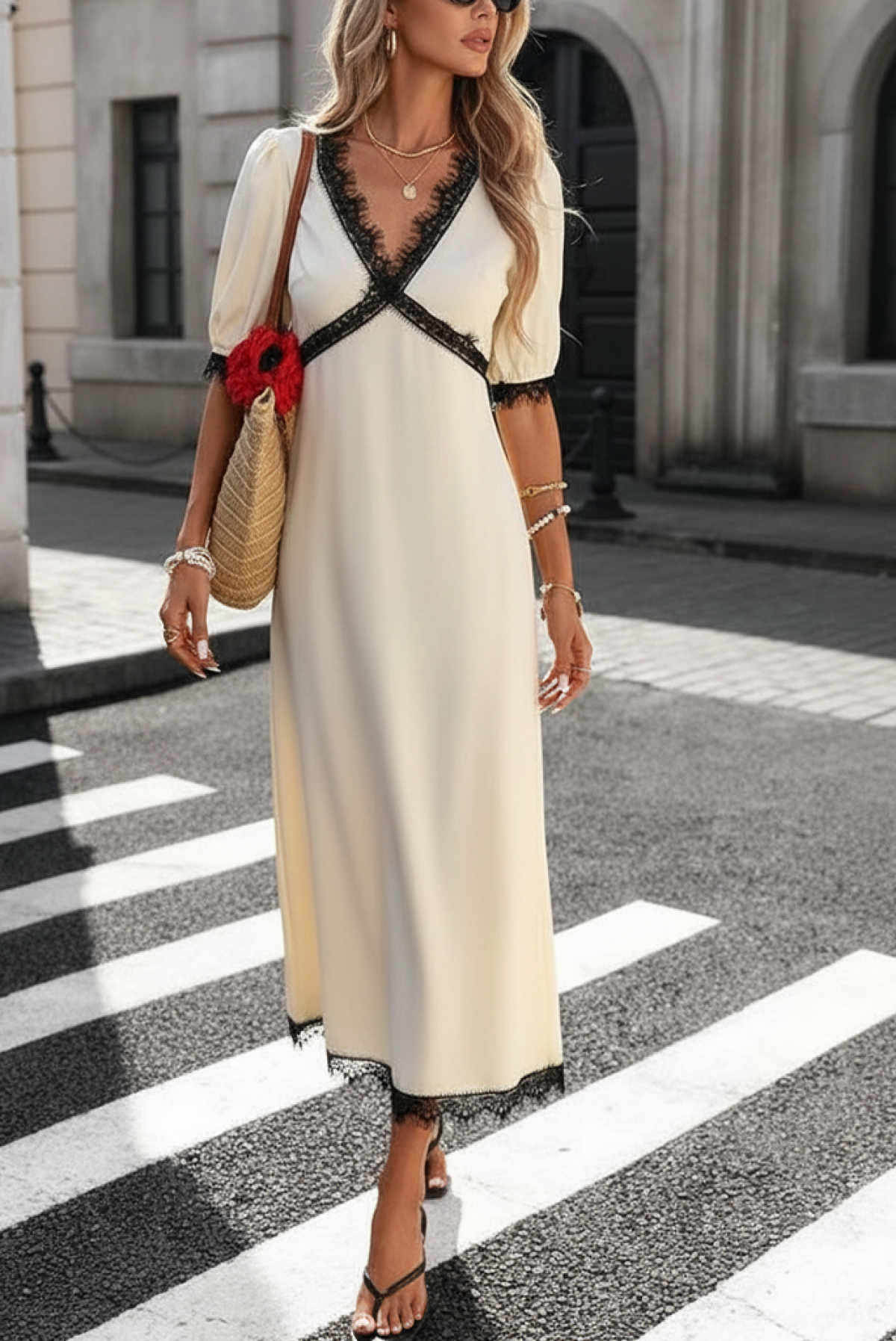 - Model ma klasyczny krój, krótką długość, kolor ecru i czarną koronkę.