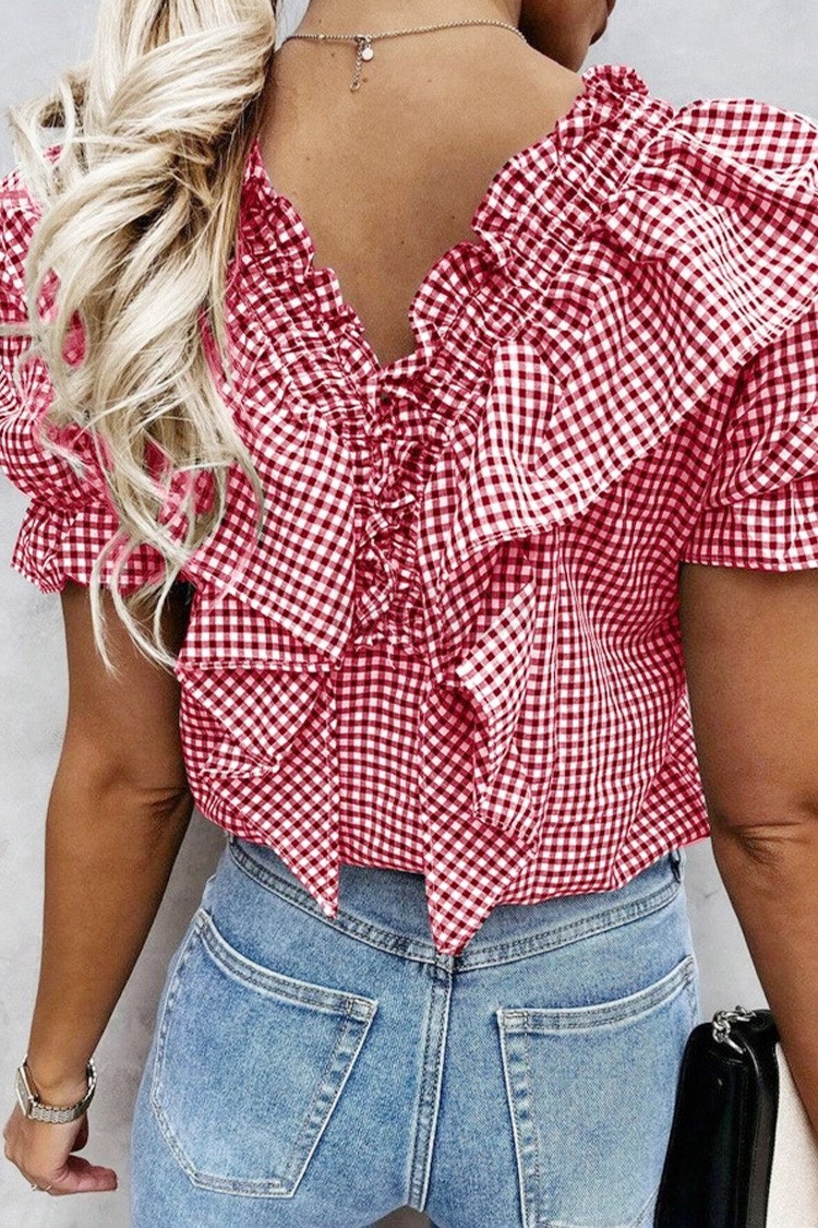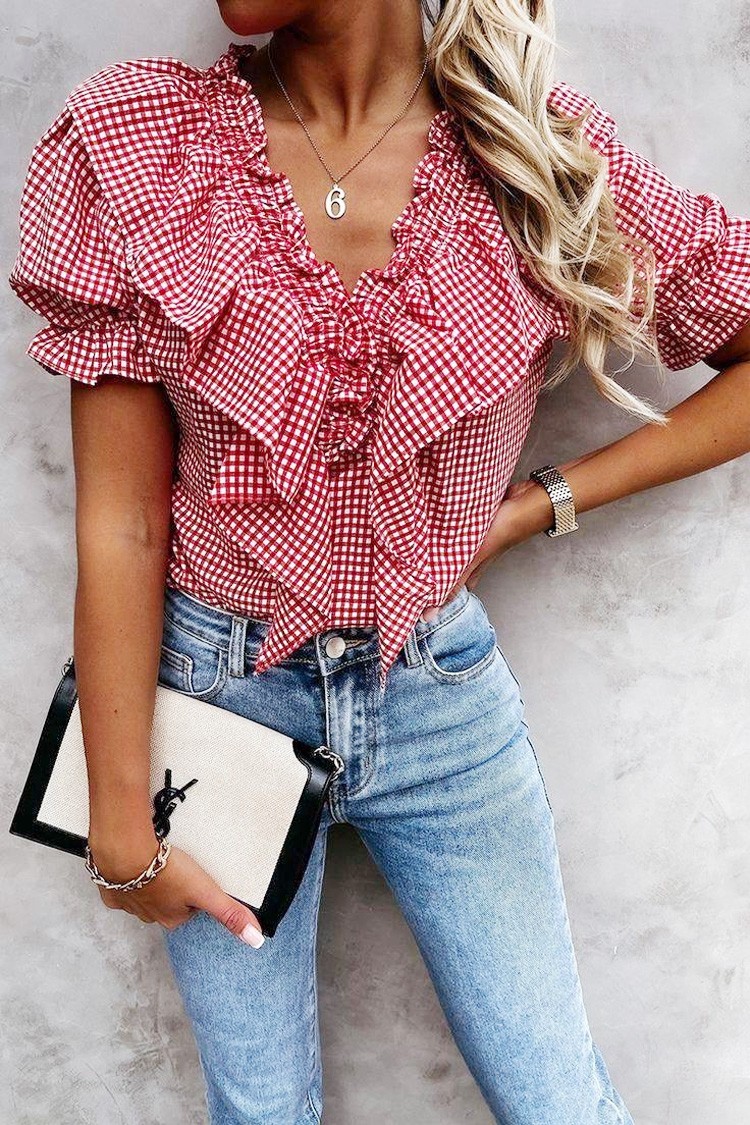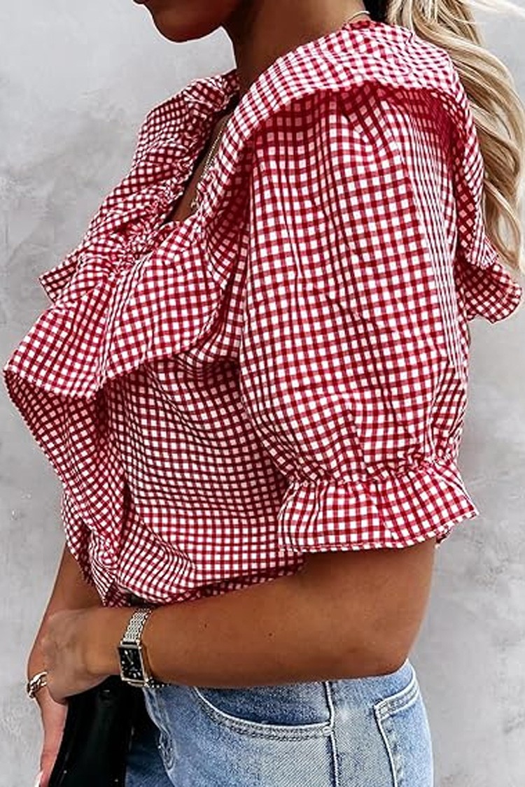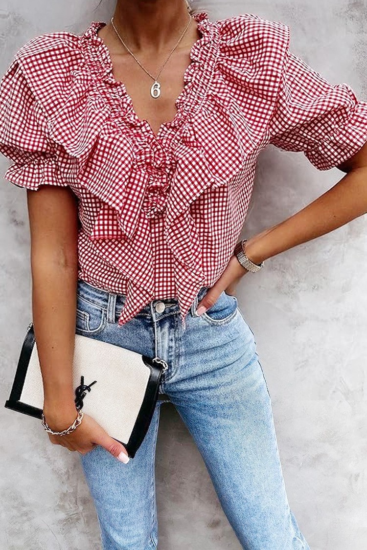 - Model ma zalotny wzór, krótkie bufiaste rękawy i wzór w kratkę.