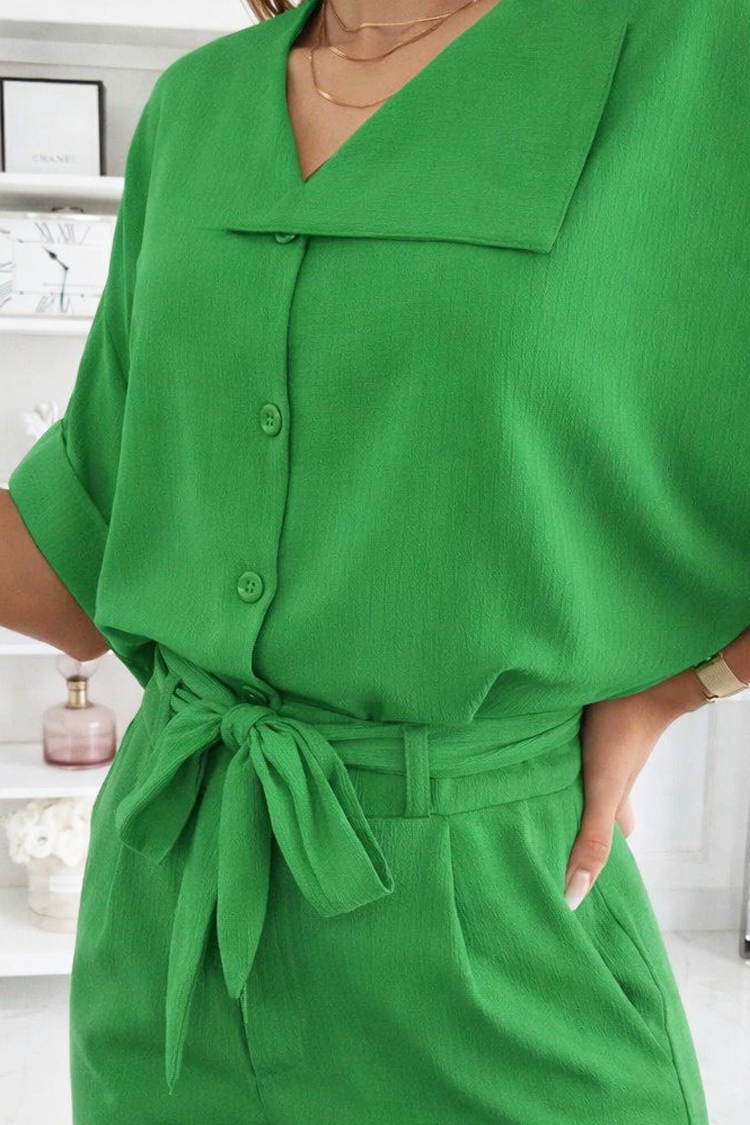 - Koszula ma asymetryczny krój, zapinana na guziki, luźny krój i krótkie rękawy.