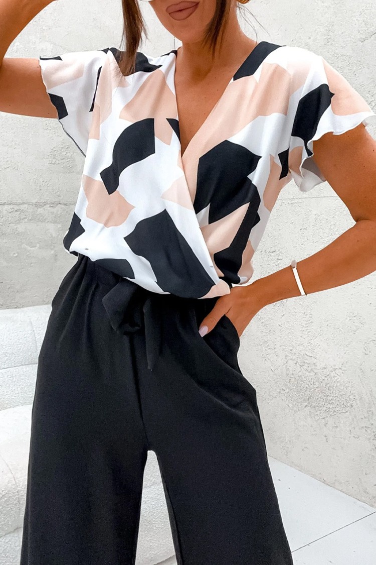 - Stylowy damski kombinezon o wielokolorowym wzorze, który sprawdzi się w różnych, modnych stylizacjach.