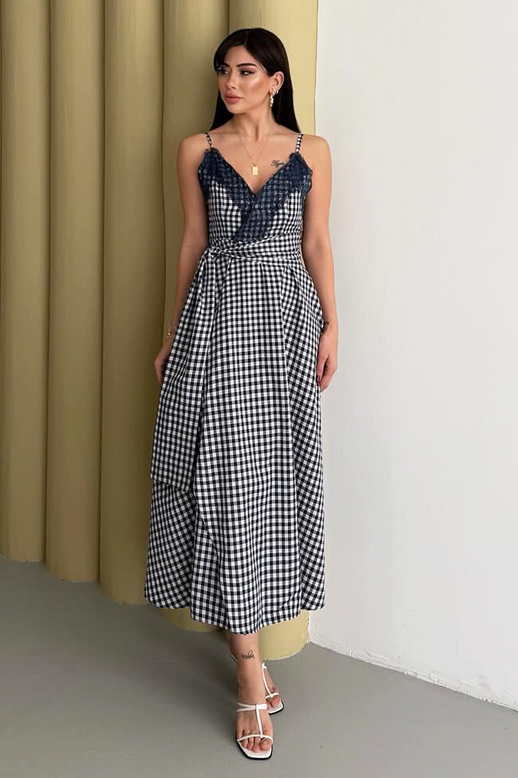 - Model ma pasek w talii i dekolt w kształcie litery V z koronkowymi akcentami.