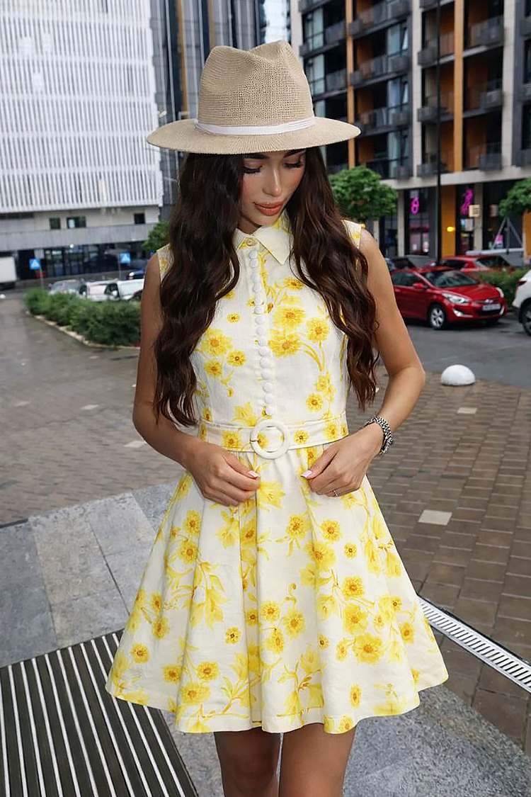 - Model ma krótki krój, kołnierzyk, guziki, kwiatowy wzór i pasek z tego samego materiału