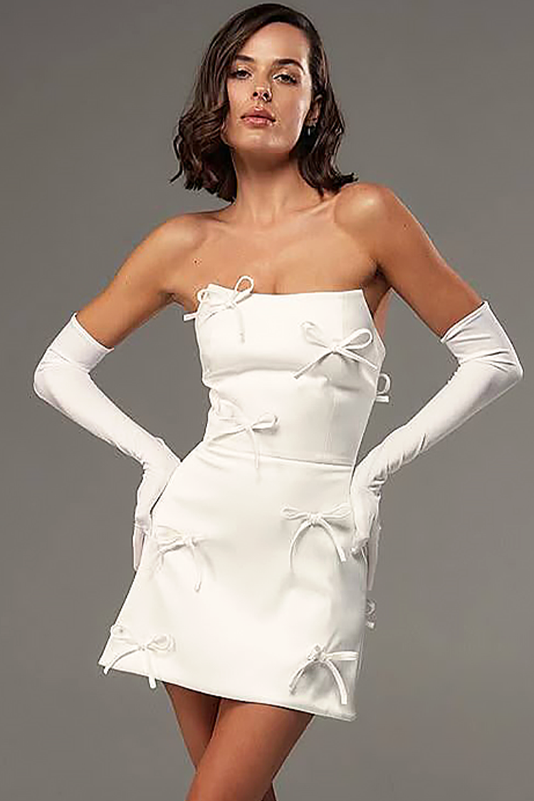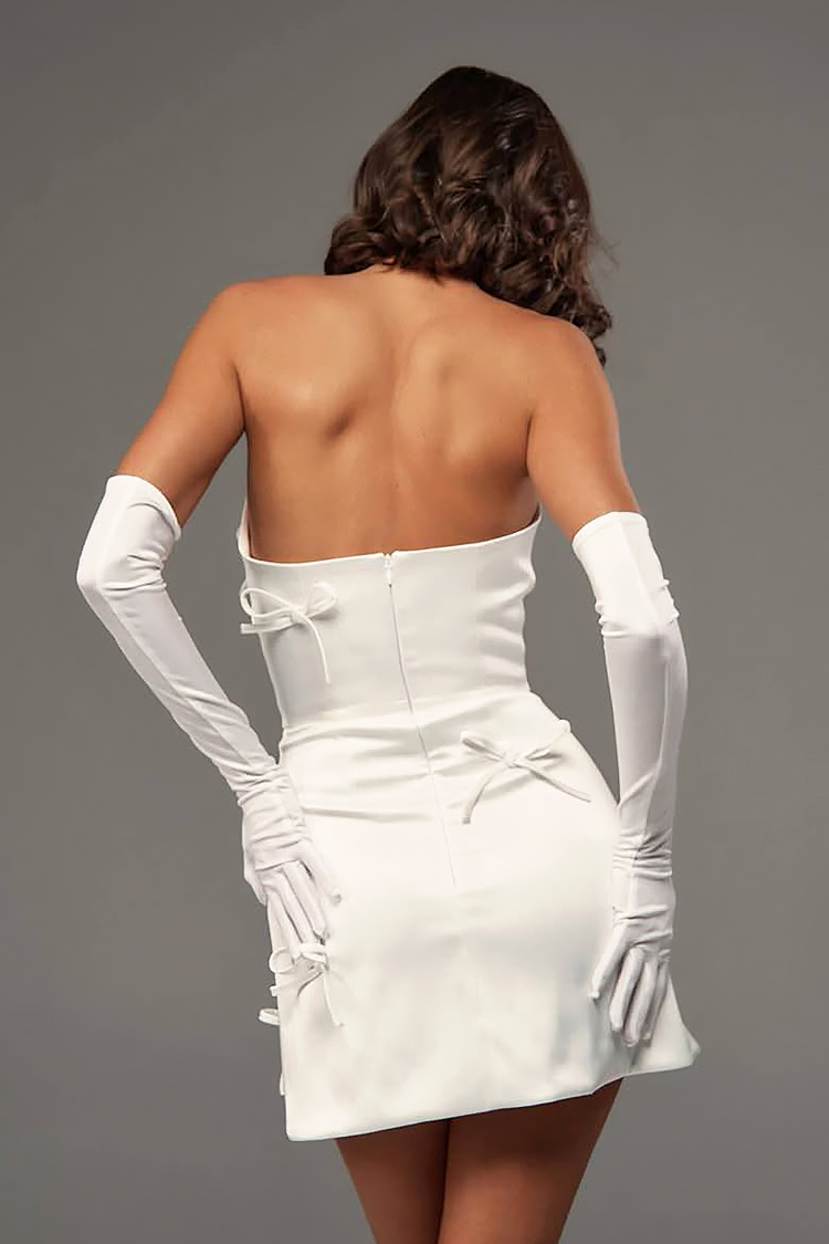- Sukienka ma krój body, seksowny dekolt, kokardki na całej długości i eleganckie rękawiczki.