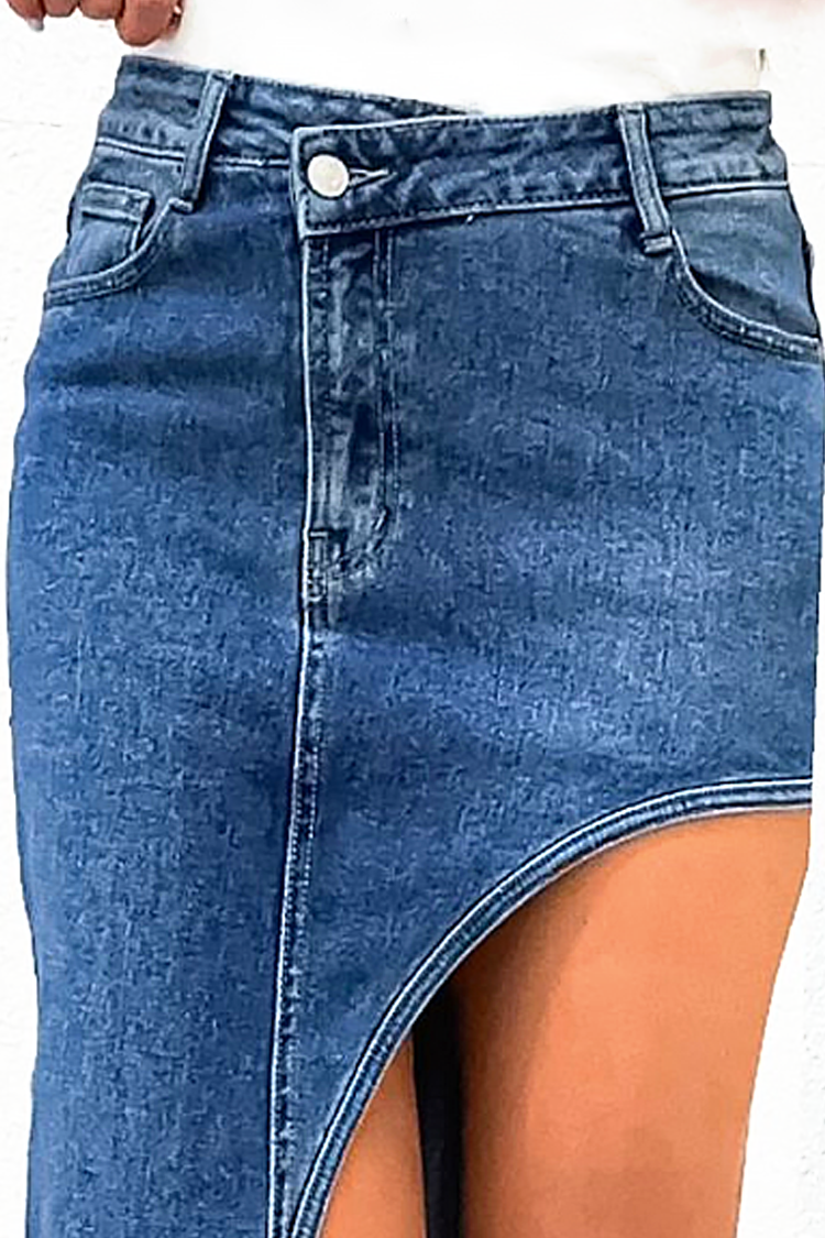 - Aby uzyskać modny wygląd, wybierz tę spódnicę jeansową midi, która sprawdzi się w różnych stylizacjach.