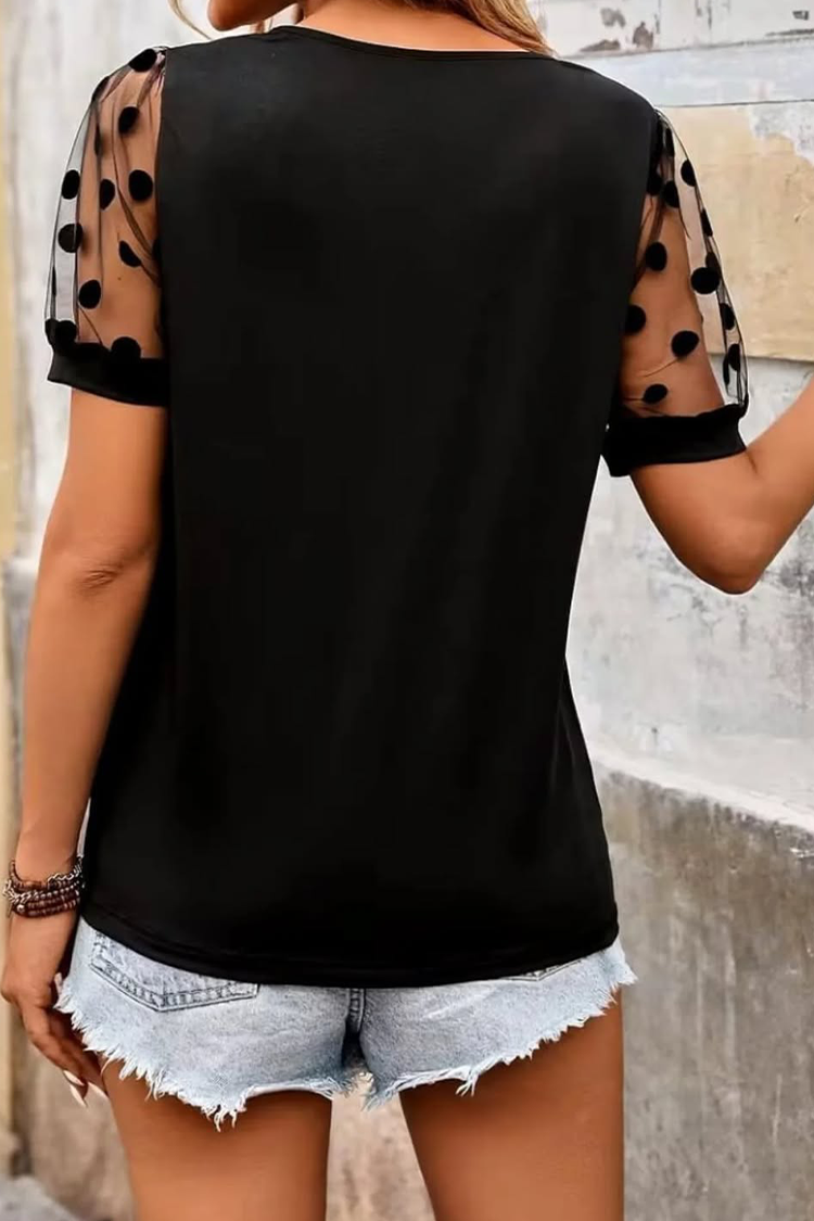 - Modelka ma elegancki krój, krótkie rękawy, wzór w groszki i tiul.