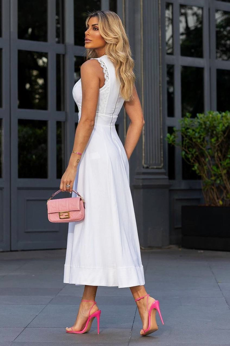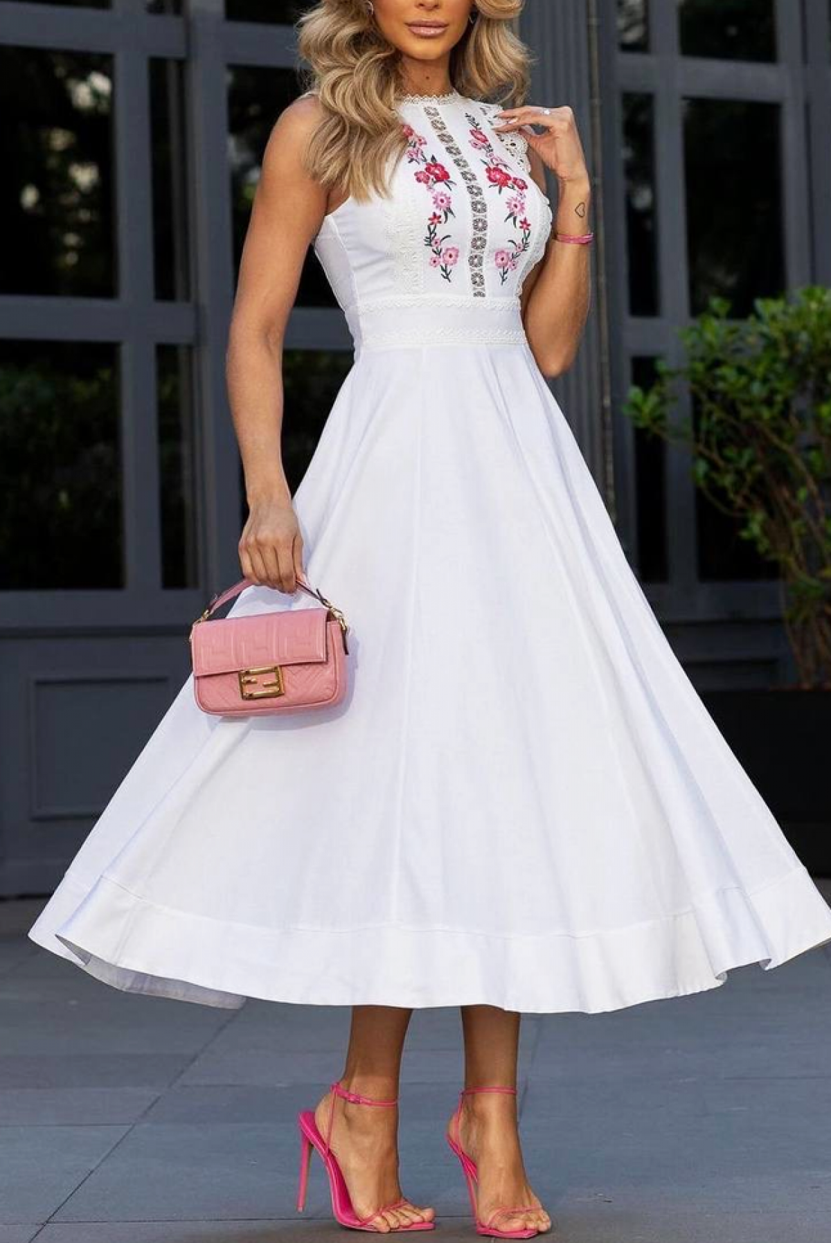 - Model ma luźny krój, bez rękawów i efektowny akcent z koronki i haftu.