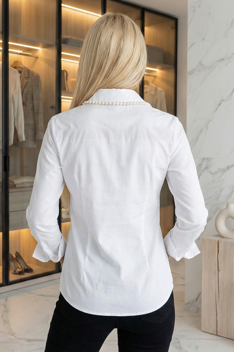 - Model ma klasyczny krój, biały kolor, kołnierzyk i krawat z perłami.